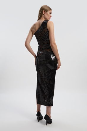 Glamour exudes from this stand-out midi dress, featuring a cowl neck that drapes with dramatic effect. Adorned with scintillating sequins that fit the body with opulence, finished with a side split for alluring effect. Pair with minimal heels and earrings for occasionwear that gives a luxury feel.