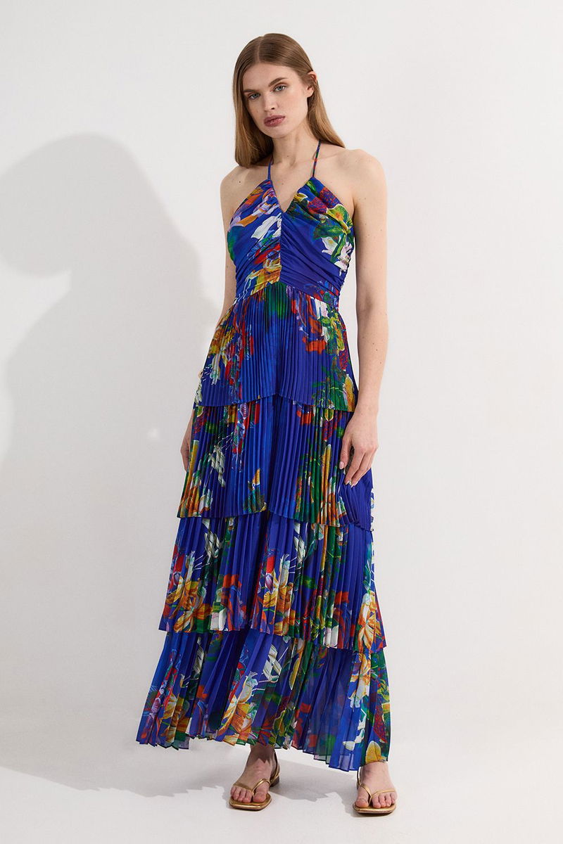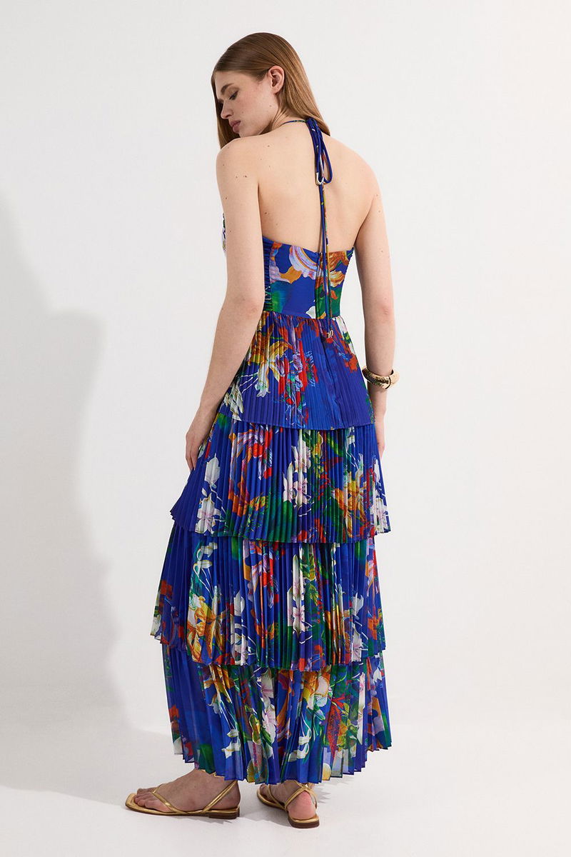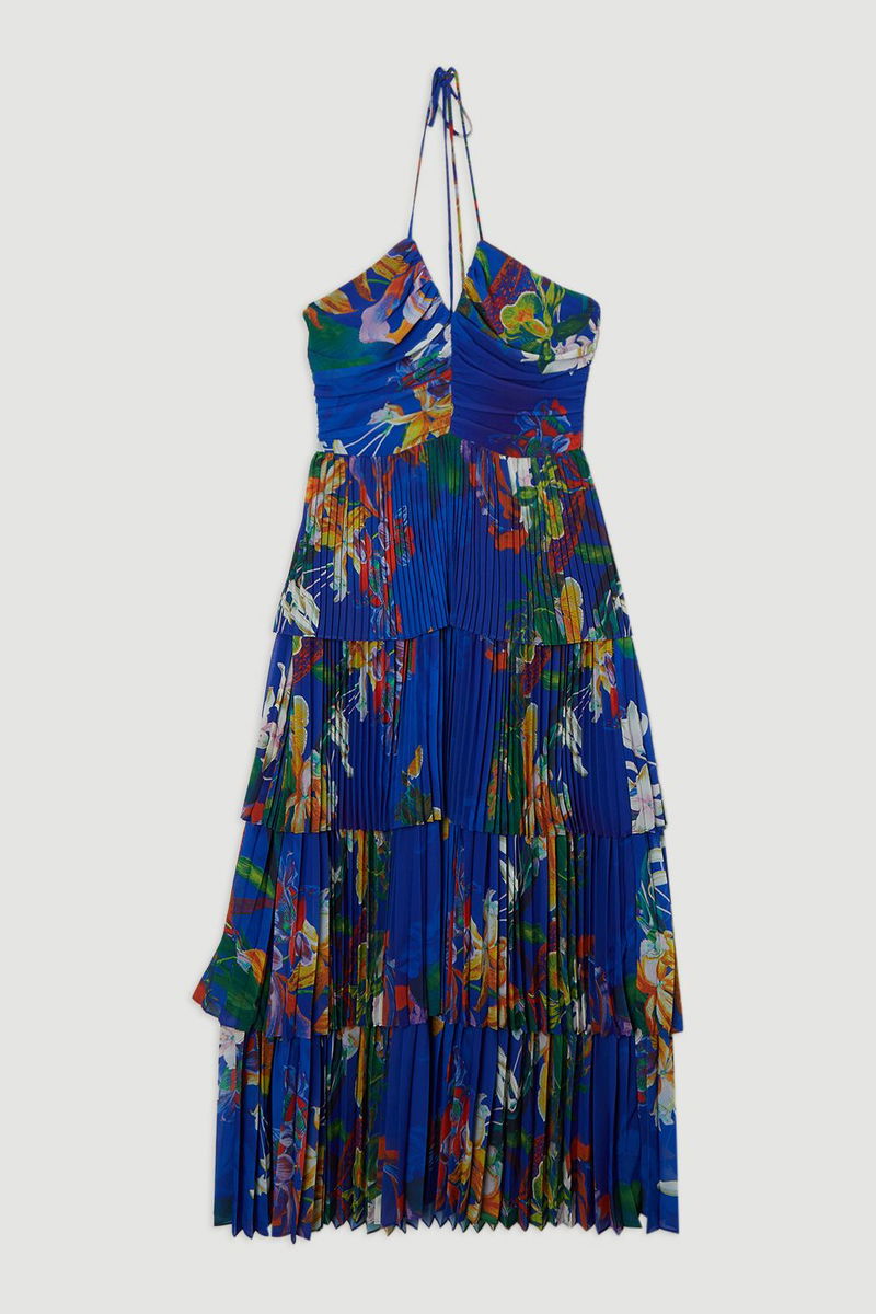 Tall Tropical Georgette Crinkle Tiered Halterneck Midi Dress