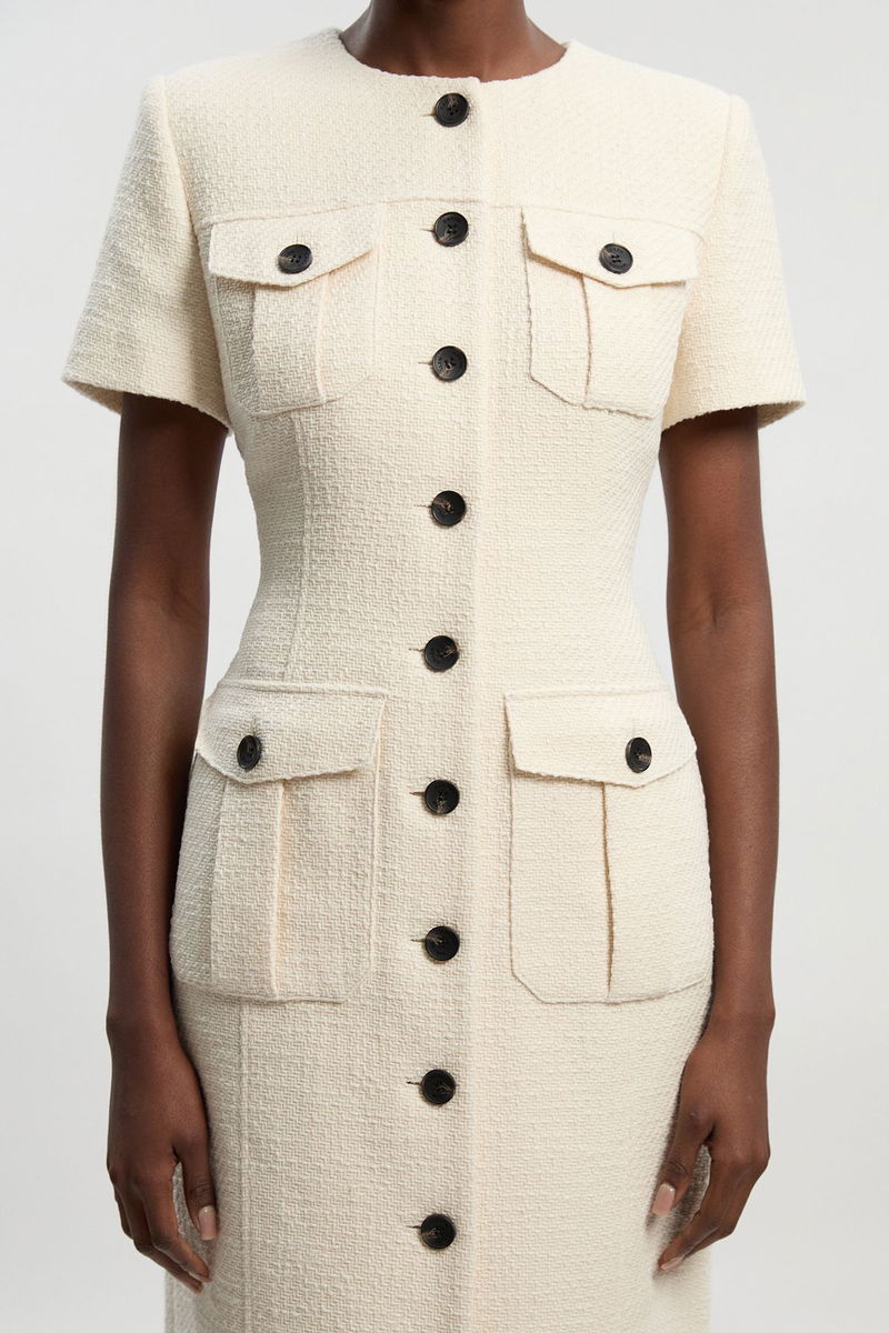 Textured Tweed Tailored Pocket Front Short Sleeve Midi Dress