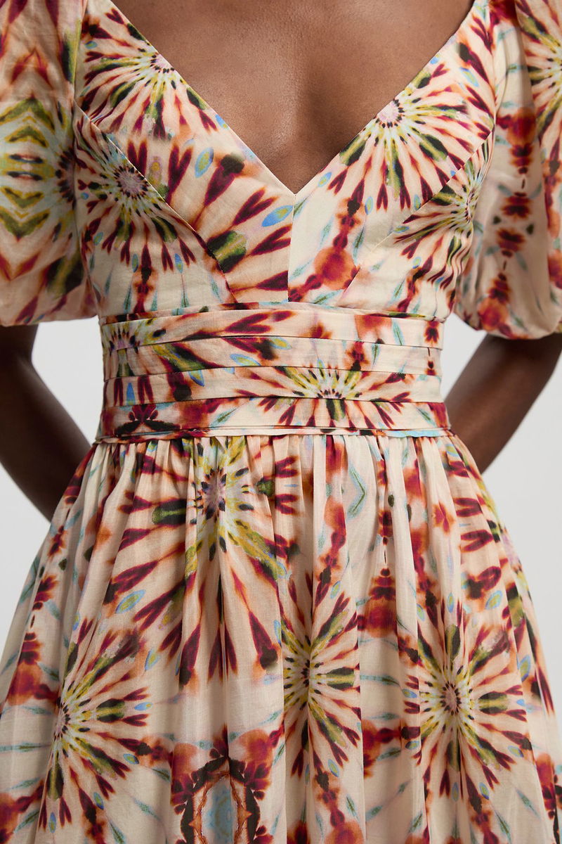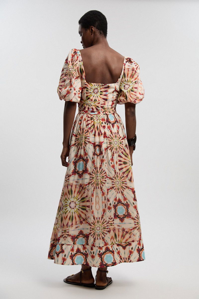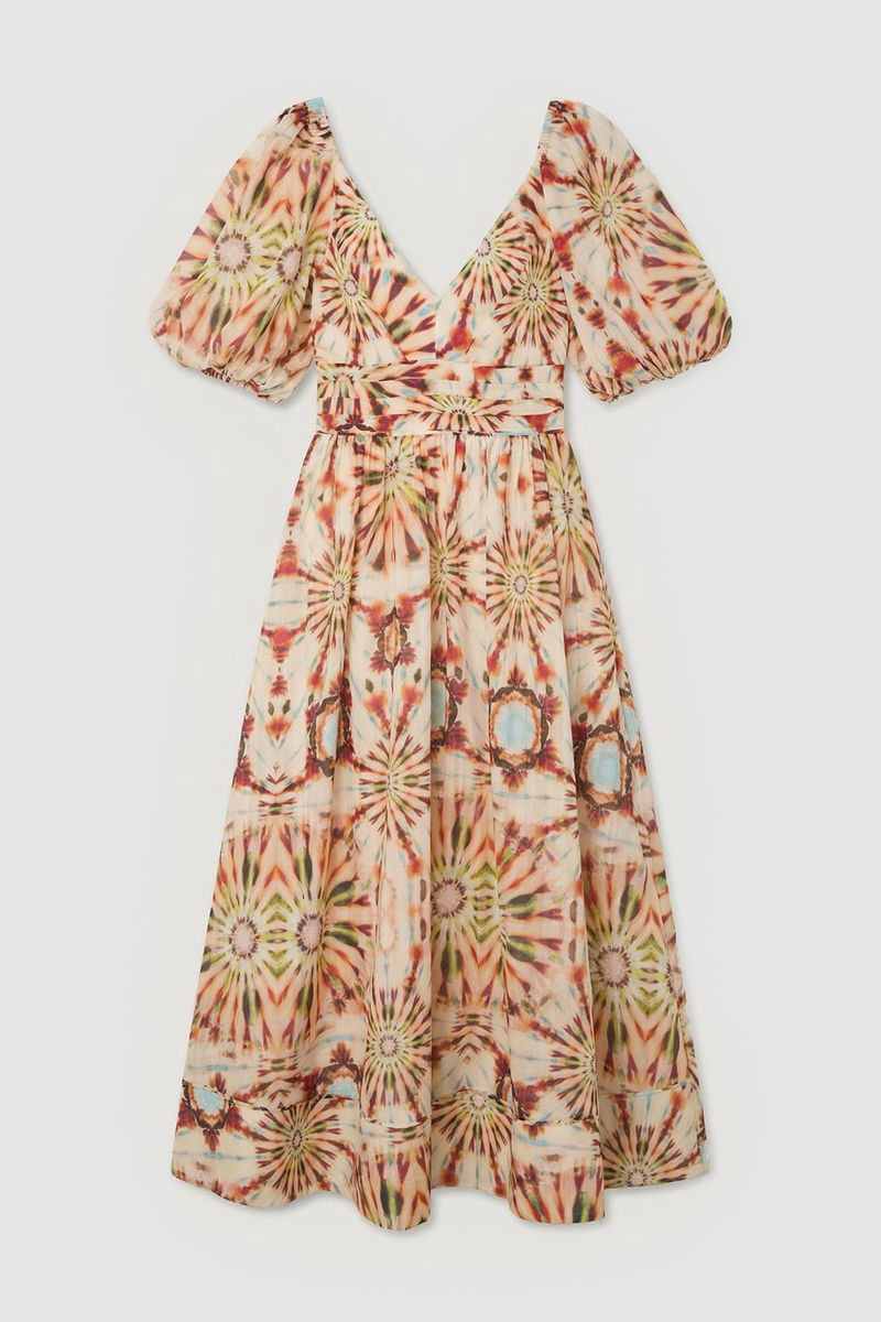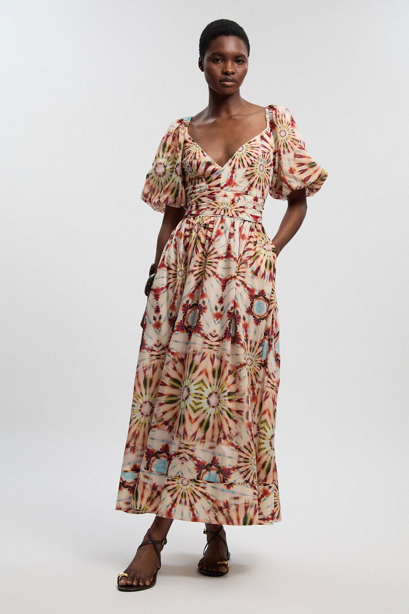 Tile Print Silk Cotton Volume Sleeve Woven Maxi Dress
