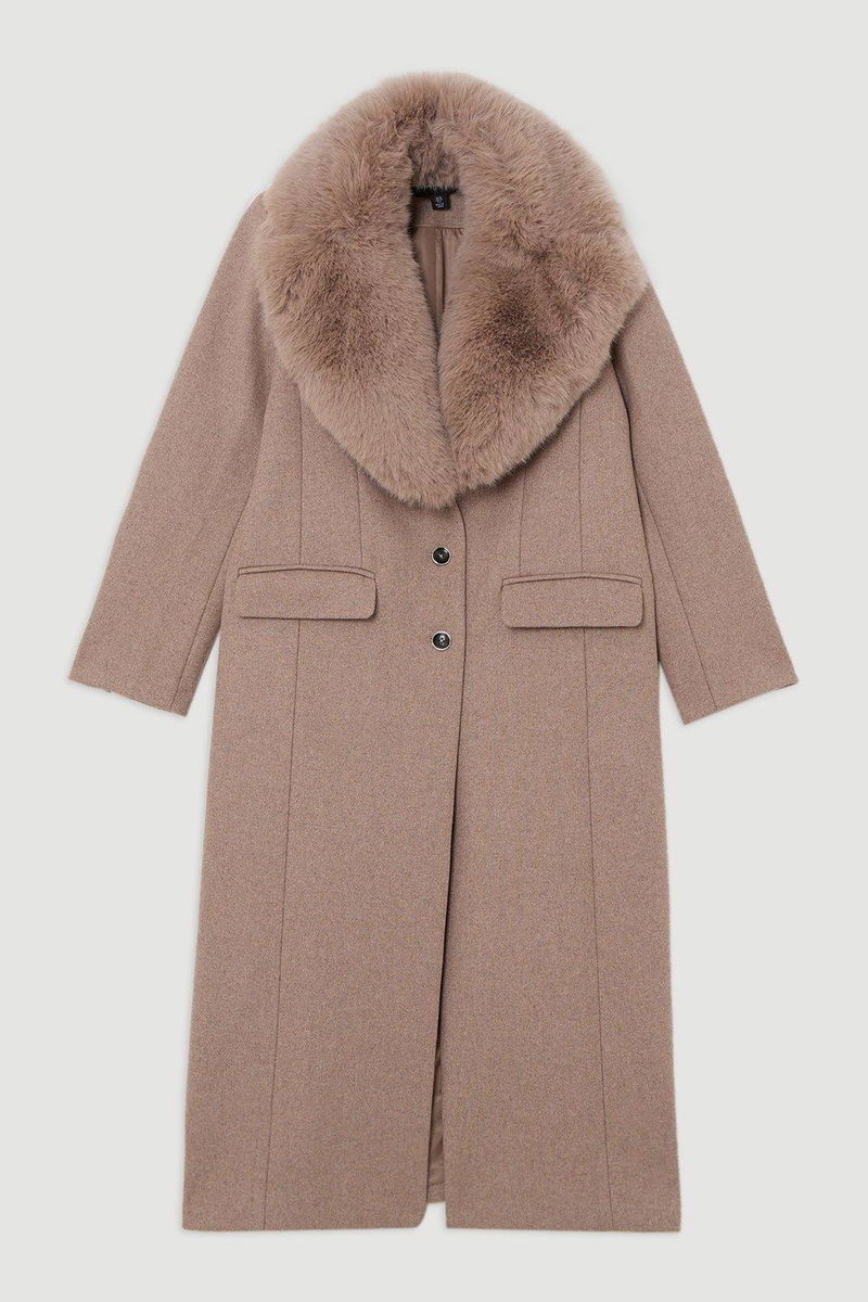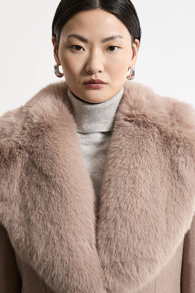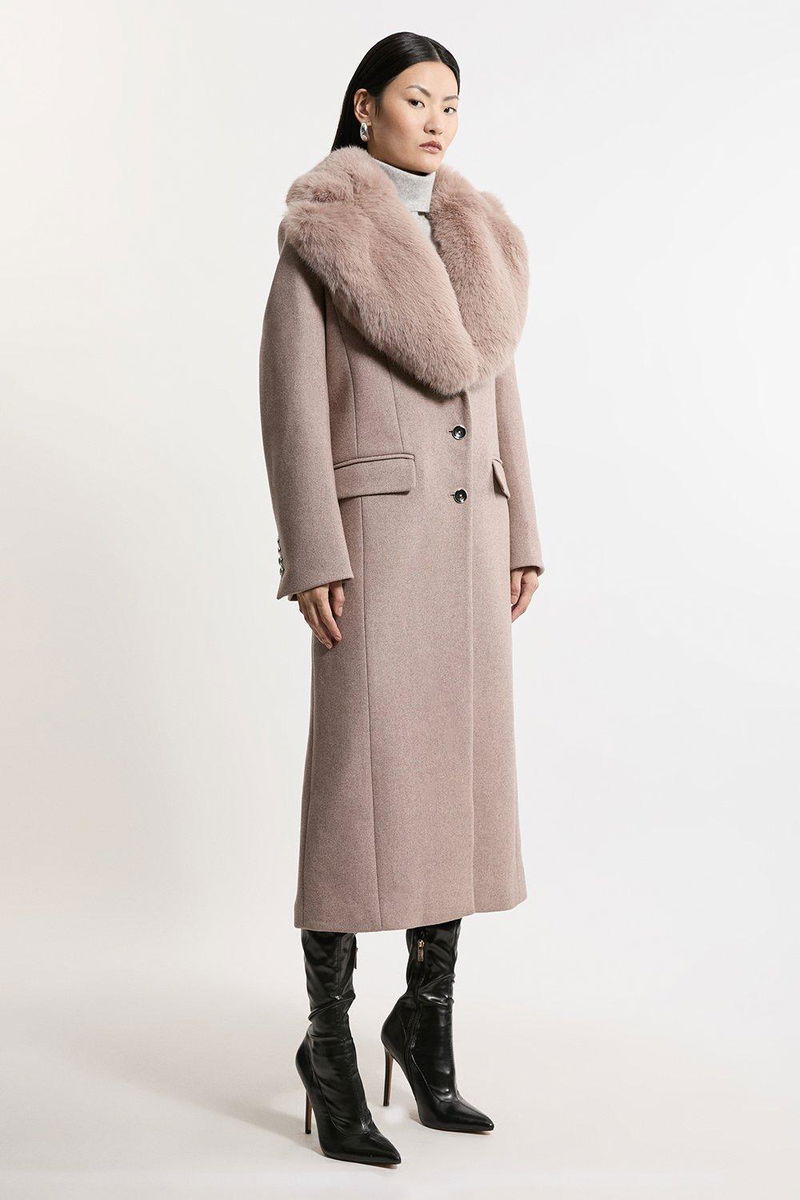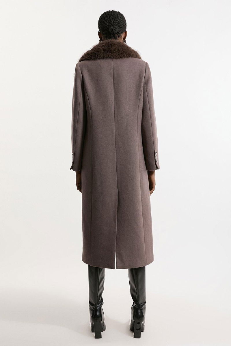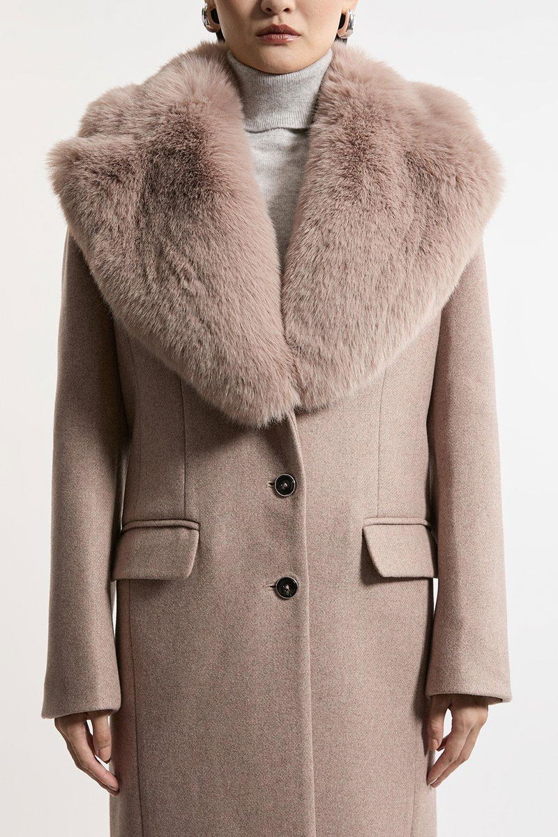 Wool Blend Fur Trim Collar Tailored Midi Coat