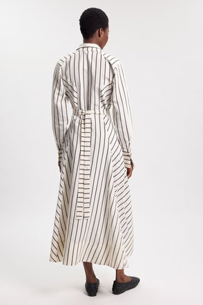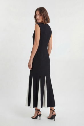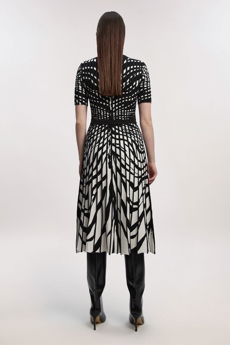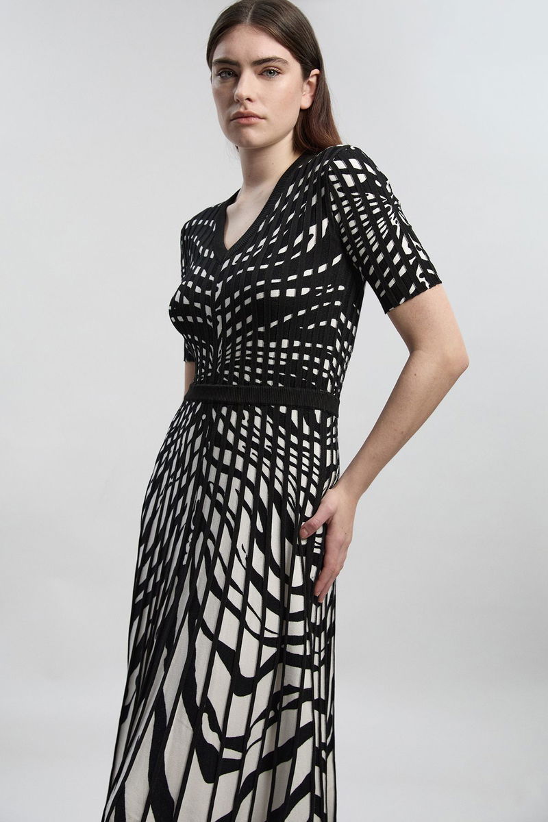 This jacquard knit midi dress showcases exceptional craftsmanship with its distinctive zebra pattern that creates a mesmerising gradient effect. The design transitions beautifully from structured bodice to flowing full skirt, creating a silhouette that's both refined and dramatic. Style with knee-high boots and an oversized clutch for an elevated daytime look that transitions effortlessly to evening occasions. For corporate settings, layer with a tailored blazer and pointed court shoes. The viscose-blend fabric offers comfortable wear whilst maintaining structure throughout the day. This piece works brilliantly for gallery openings, sophisticated brunches, or upmarket social gatherings where making a subtle statement is essential. The versatile design allows for customisation with jewellery-opt for minimalist pieces to let the dress's artistic pattern command attention.
