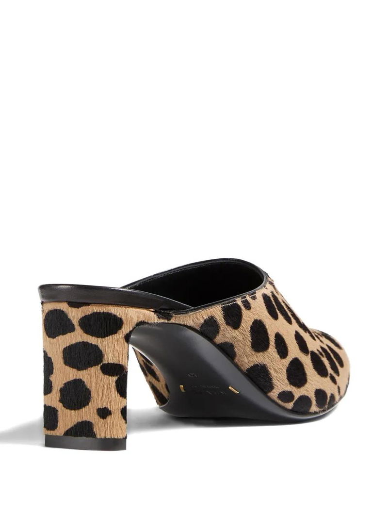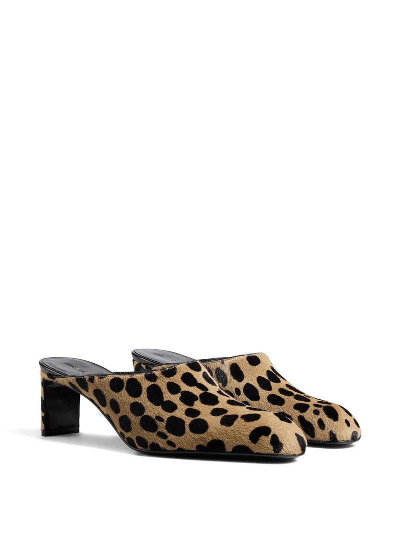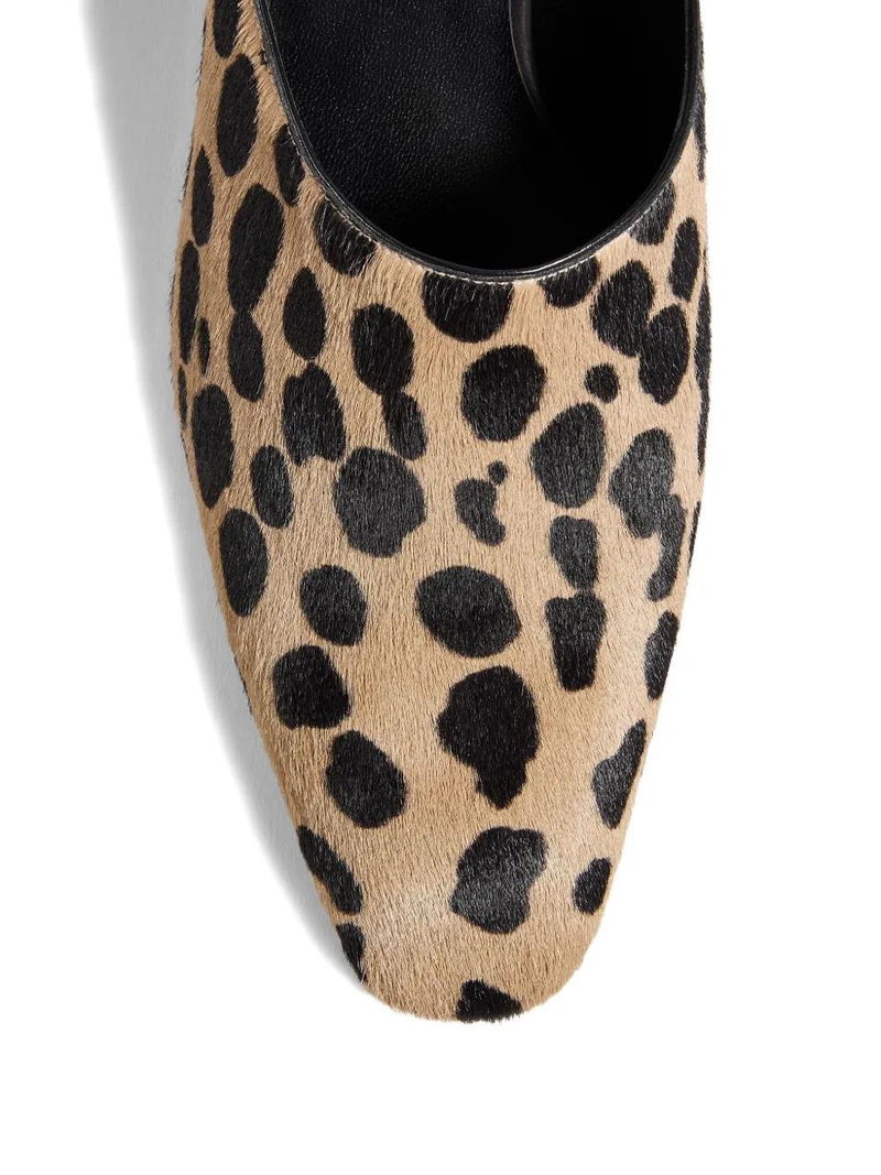 Light brown, spotted pattern, calf hair, leather sole.
