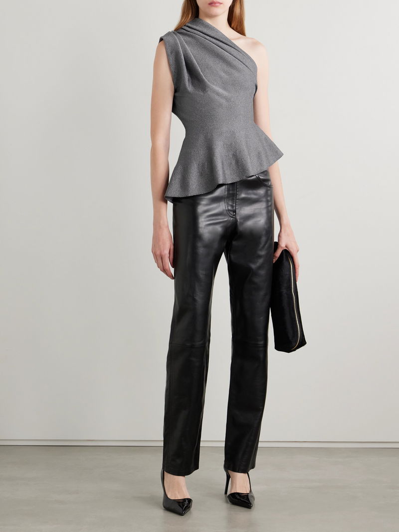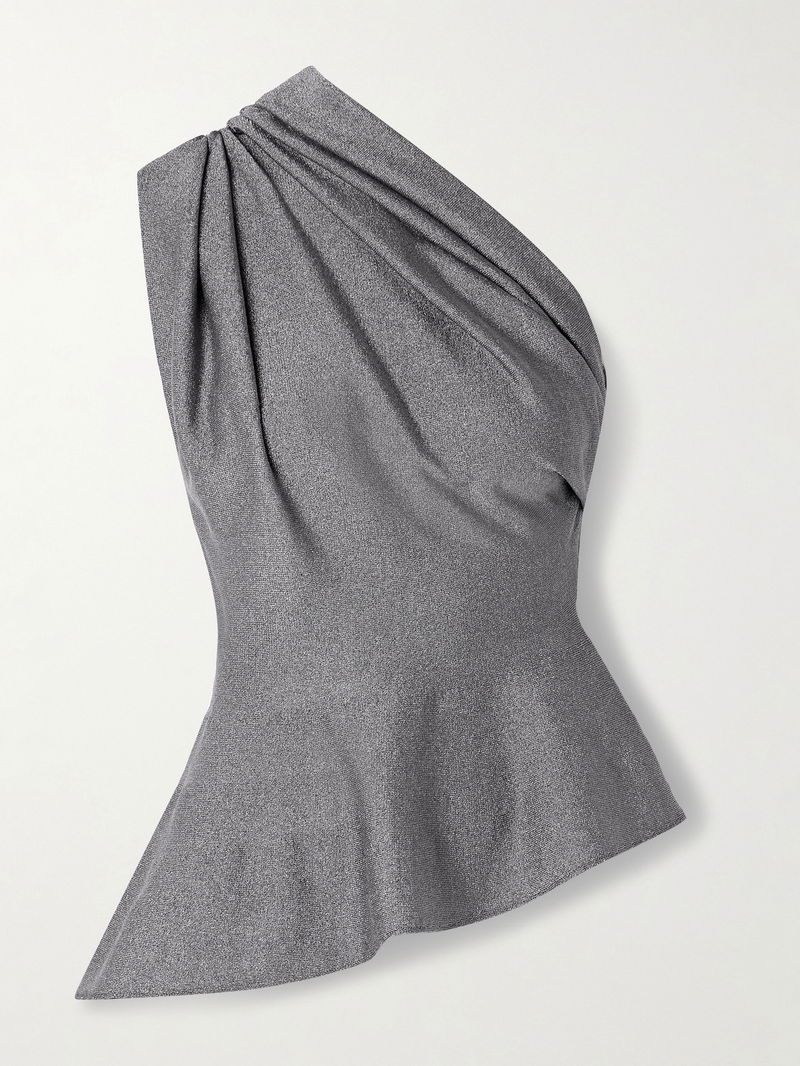 KHAITE's 'Aimee' top is knitted from Lurex spun with touches of cotton. It has an asymmetric peplum hem that mirrors the one-shoulder neckline with hand-pleated detailing.