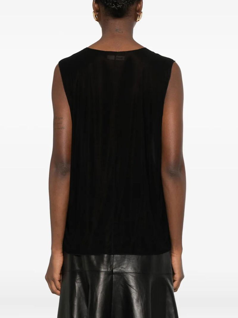 Black sleeveless round neck straight hem semi-sheer.