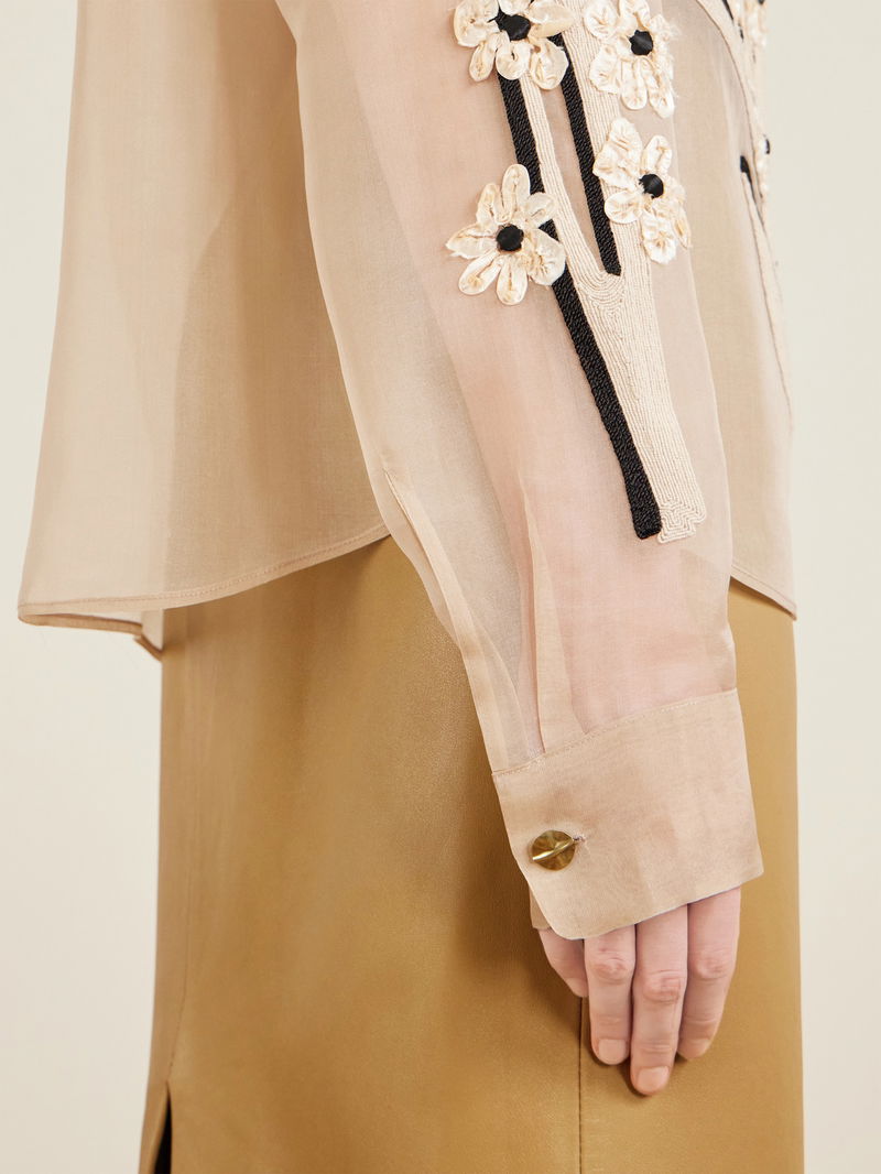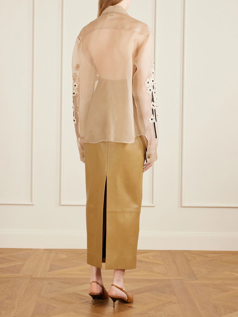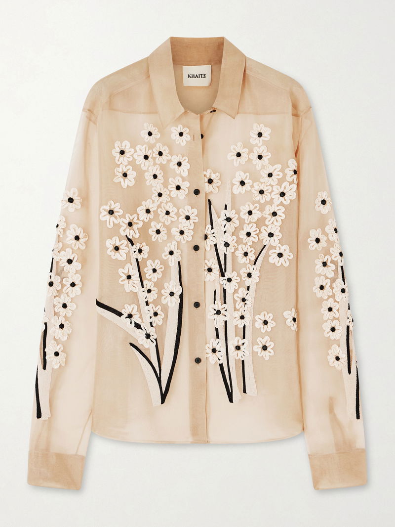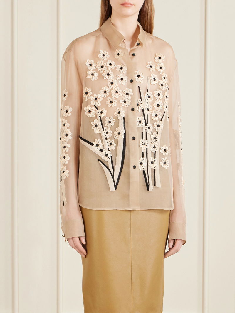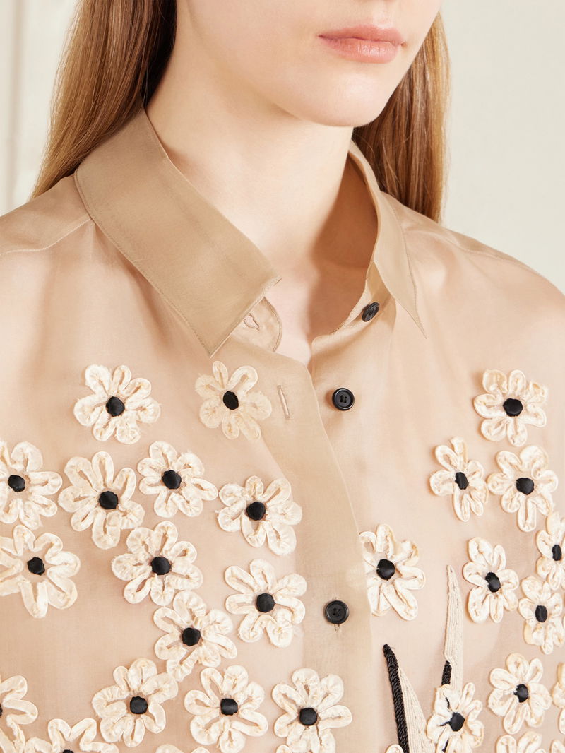 KHAITE's 'Argo' blouse is given the wow factor with floral appliqués and beaded embroidery. Worn on the Spring '26 runway, it's made from silk-organza that's slightly sheer and has a slightly loose shape.