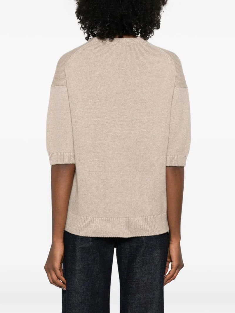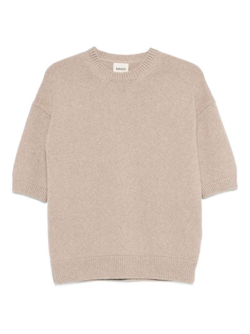 Beige round neck short sleeves ribbed hem ribbed cuffs straight hem.