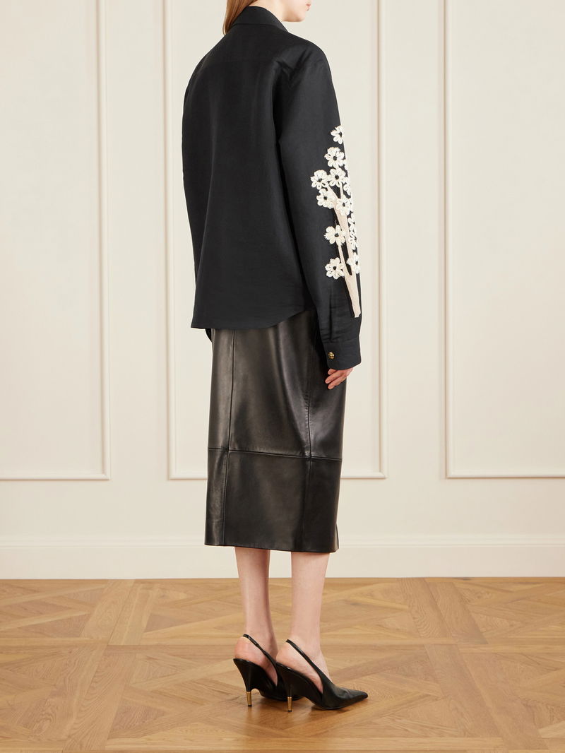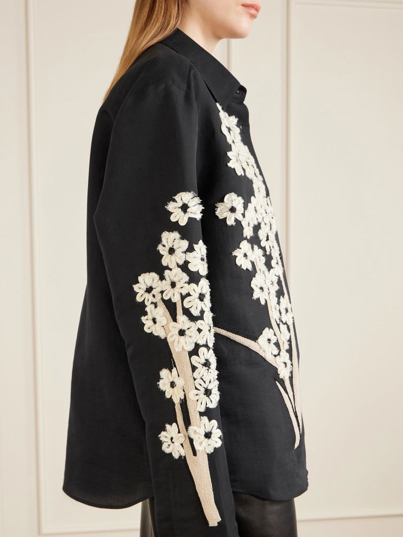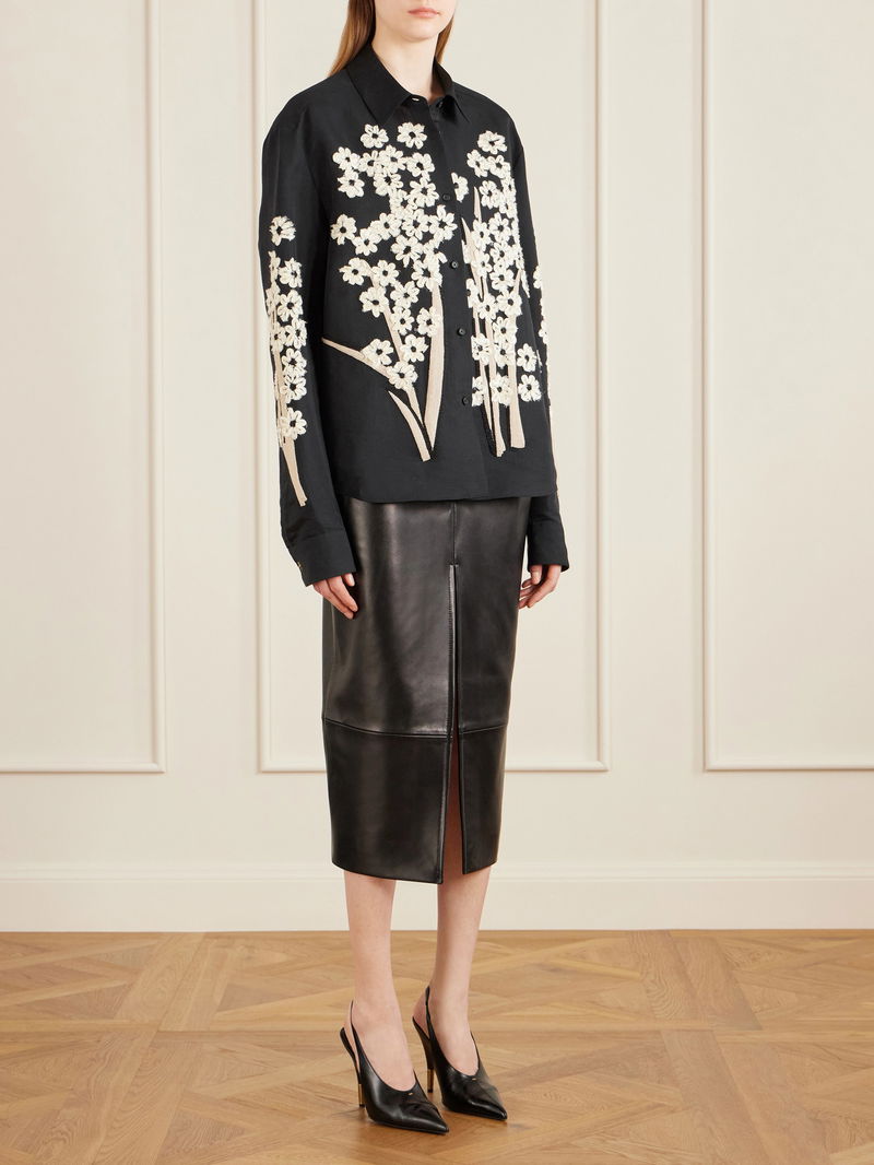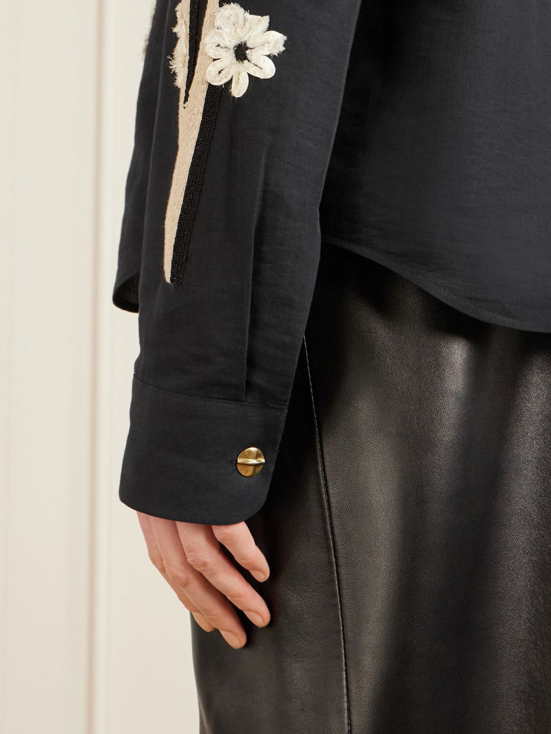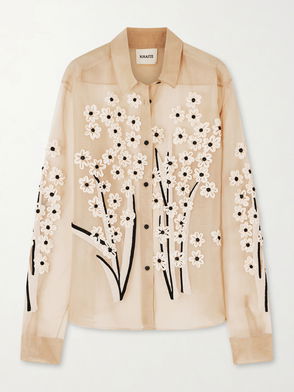 Creative Director Catherine Holstein explores the notion of imperfection for KHAITE's Spring '26 collection. Worn on the runway, this 'Argo' blouse is made from silk and cotton-blend and beautifully appliquéd with flowers and leaves. Take cues from the show styling and leave the first few buttons undone.