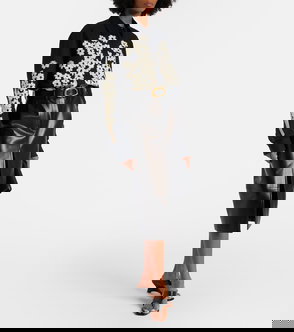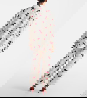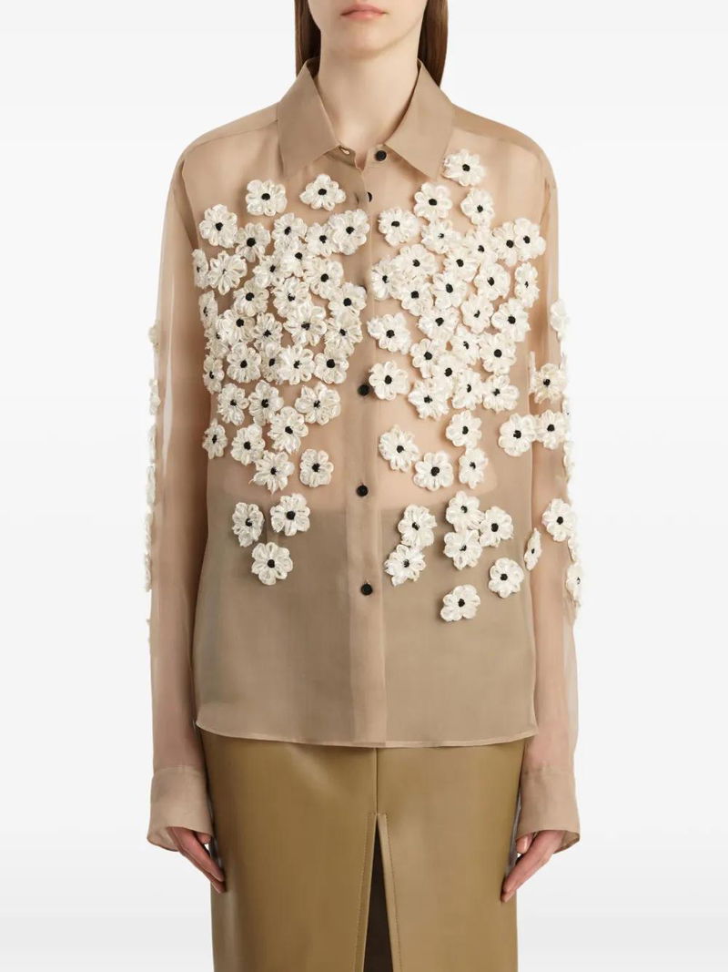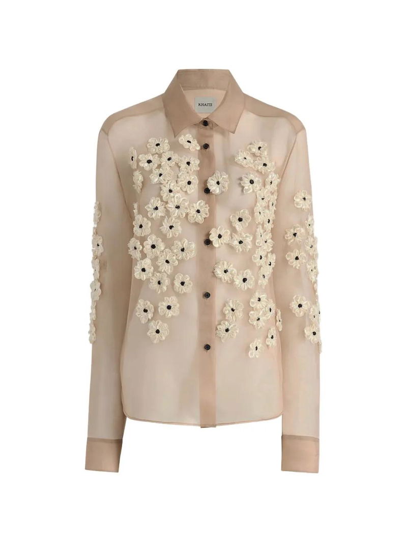 A menswear-inspired button-up transformed by dimensional embroidery: flowers of satin ribbon and intricate cording, each element applied by hand on sheer silk organza selected for its lightweight structure and crisp character.