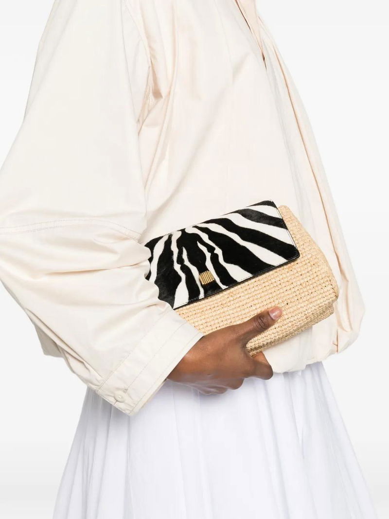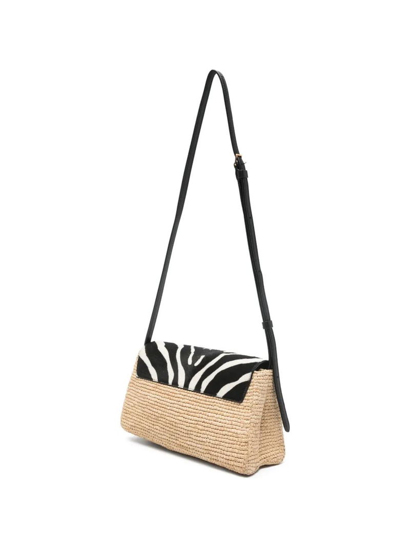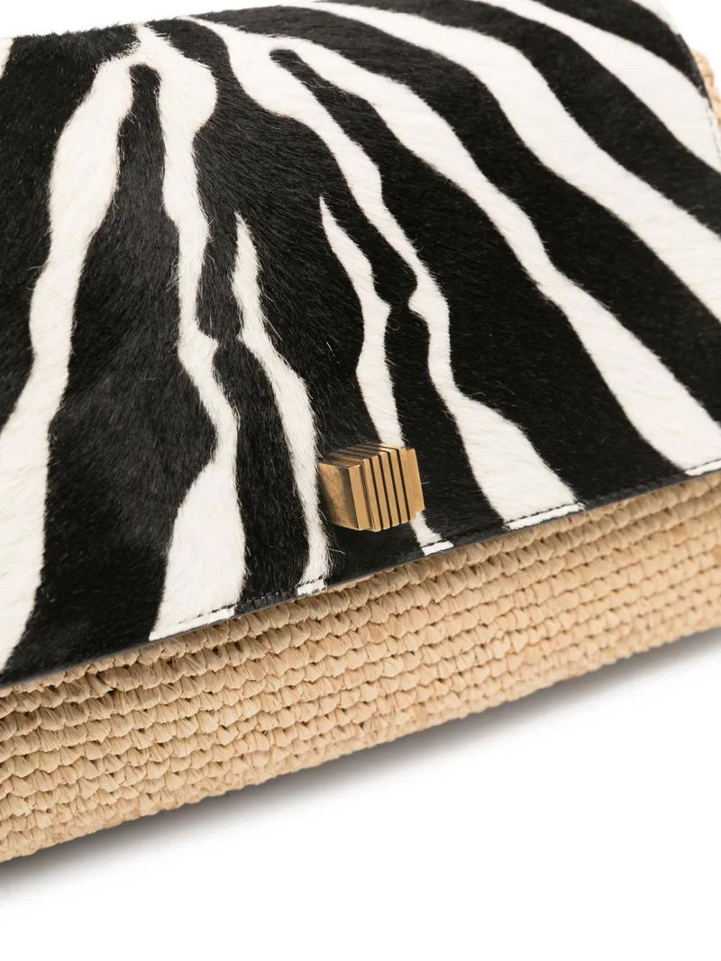Beige, zebra-print detail, adjustable shoulder strap.