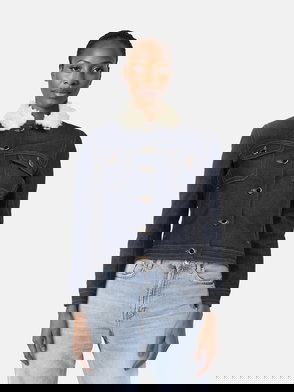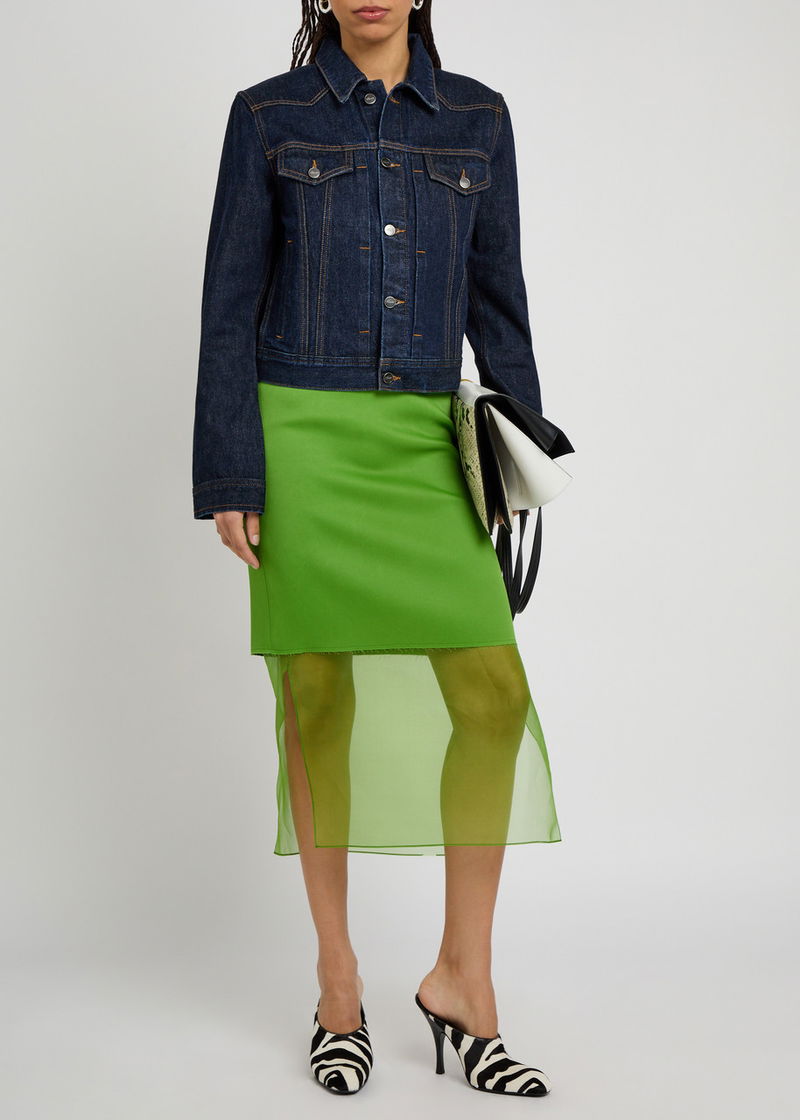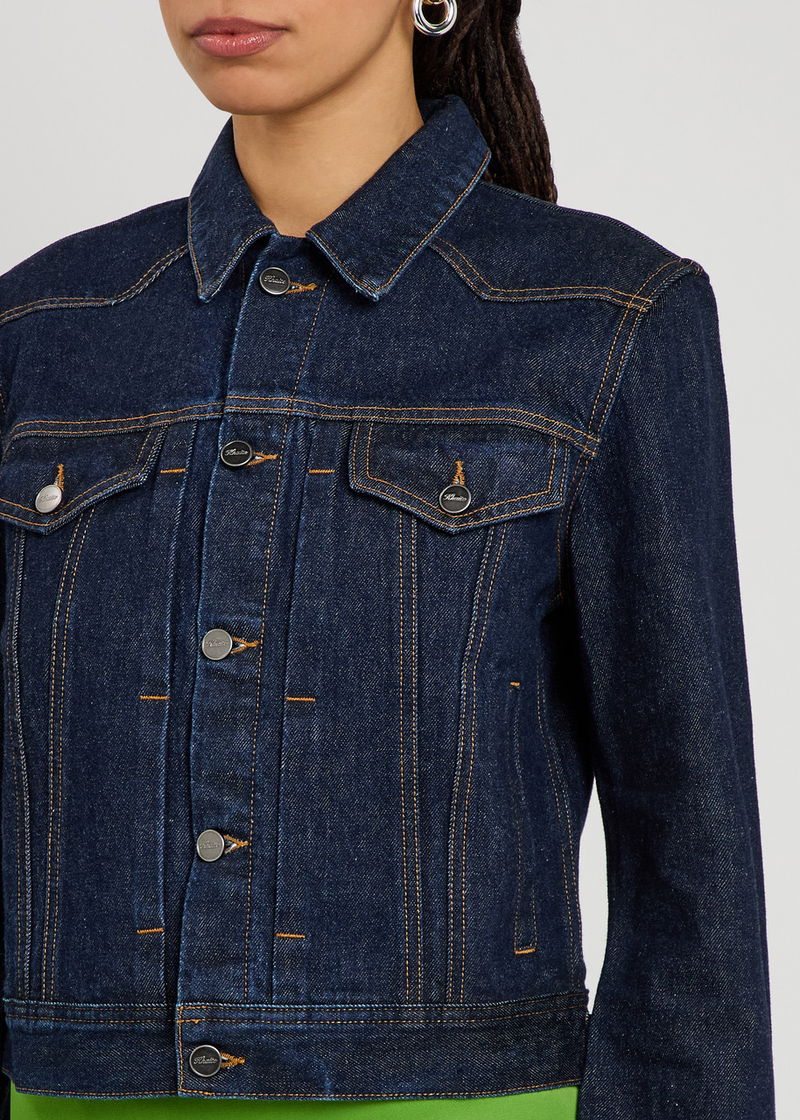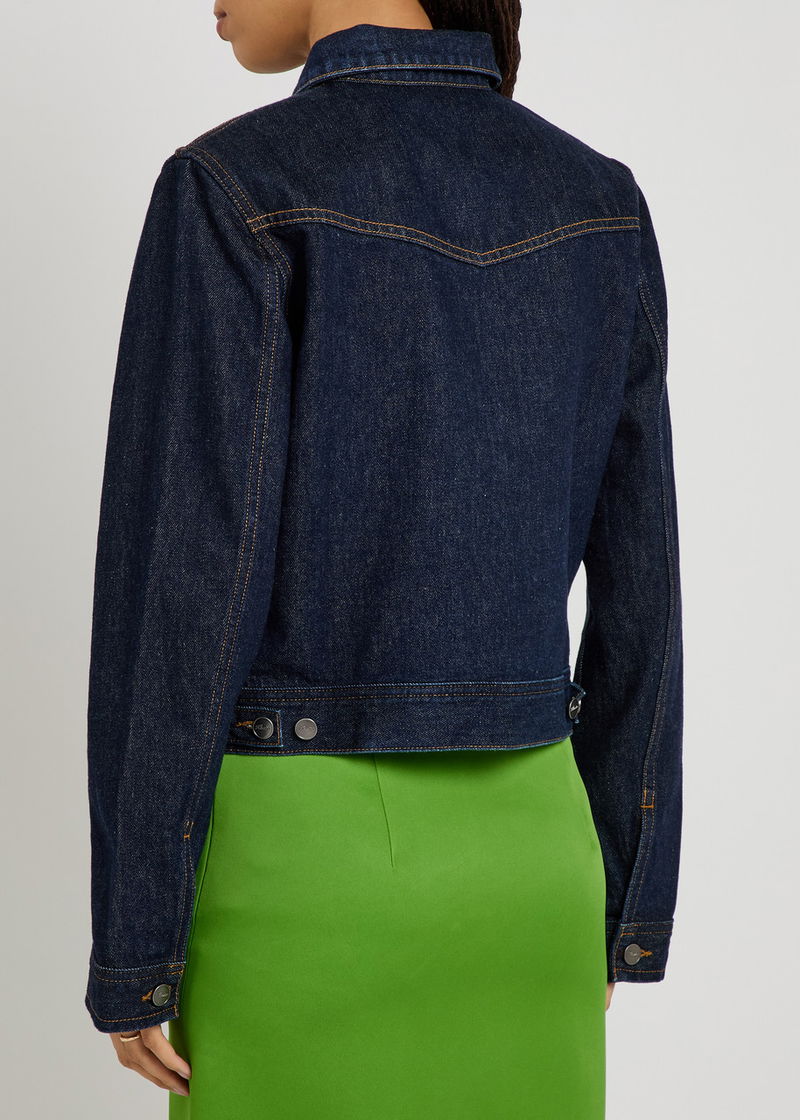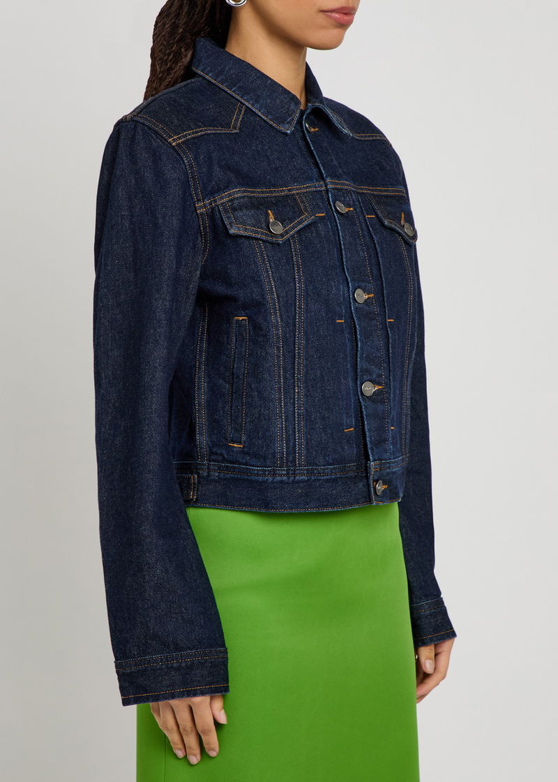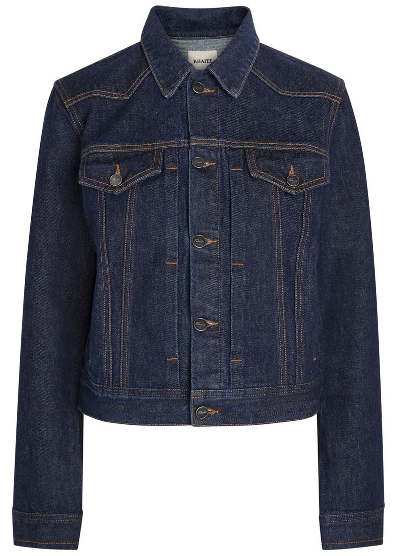 Khaite denim jacket. Button-fastening cuffs, button-fastening chest flap pockets, side slip pockets, adjustable button-fastening hem, contrasting seams. Button fastening through front.