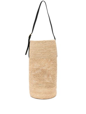 Beige, woven raffia, bucket shape, adjustable strap.