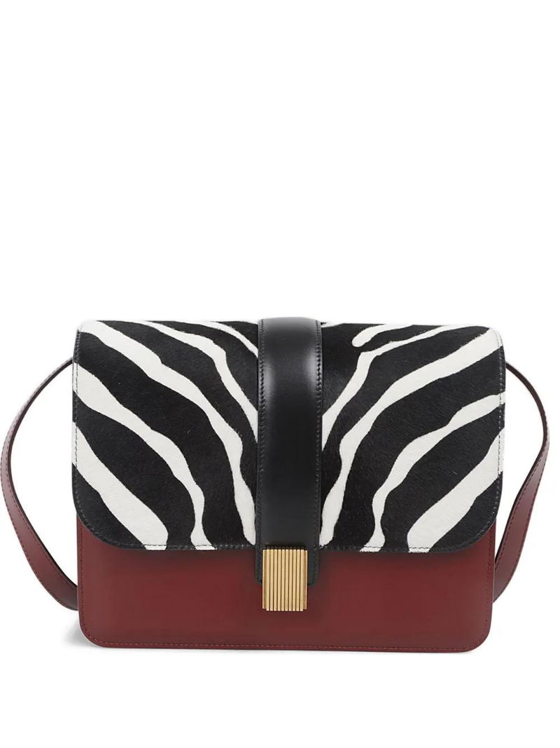 Red, zebra pattern, adjustable strap, gold-tone hardware.
