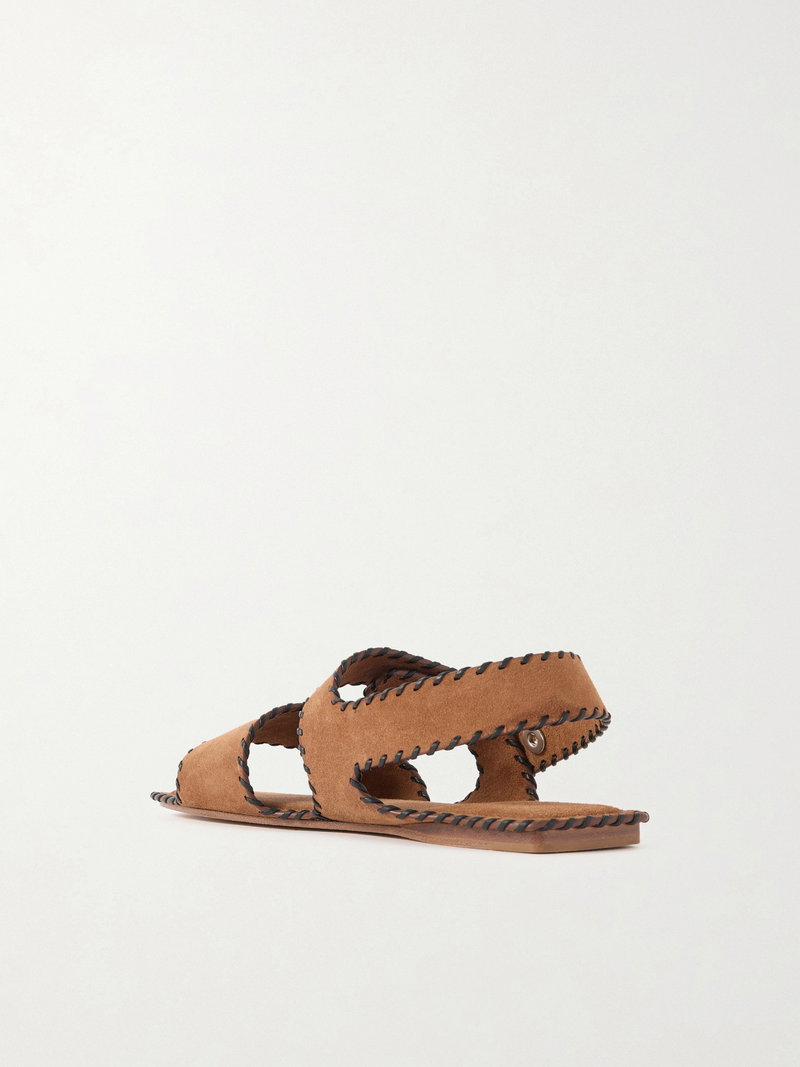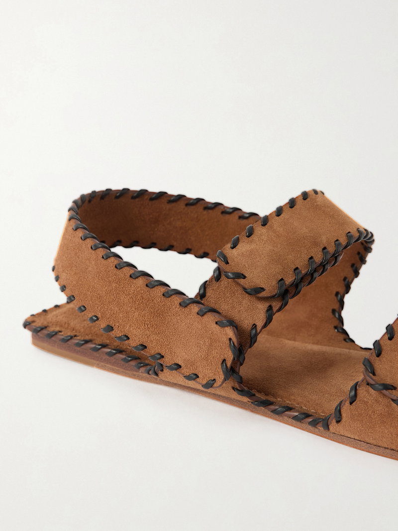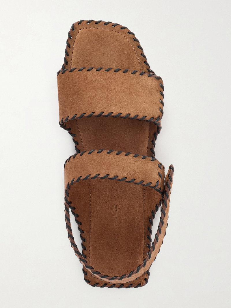 They're made from soft suede and have leather whipstitching tracing the wide straps.
