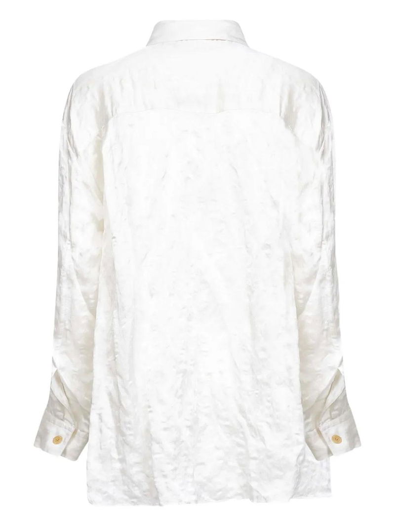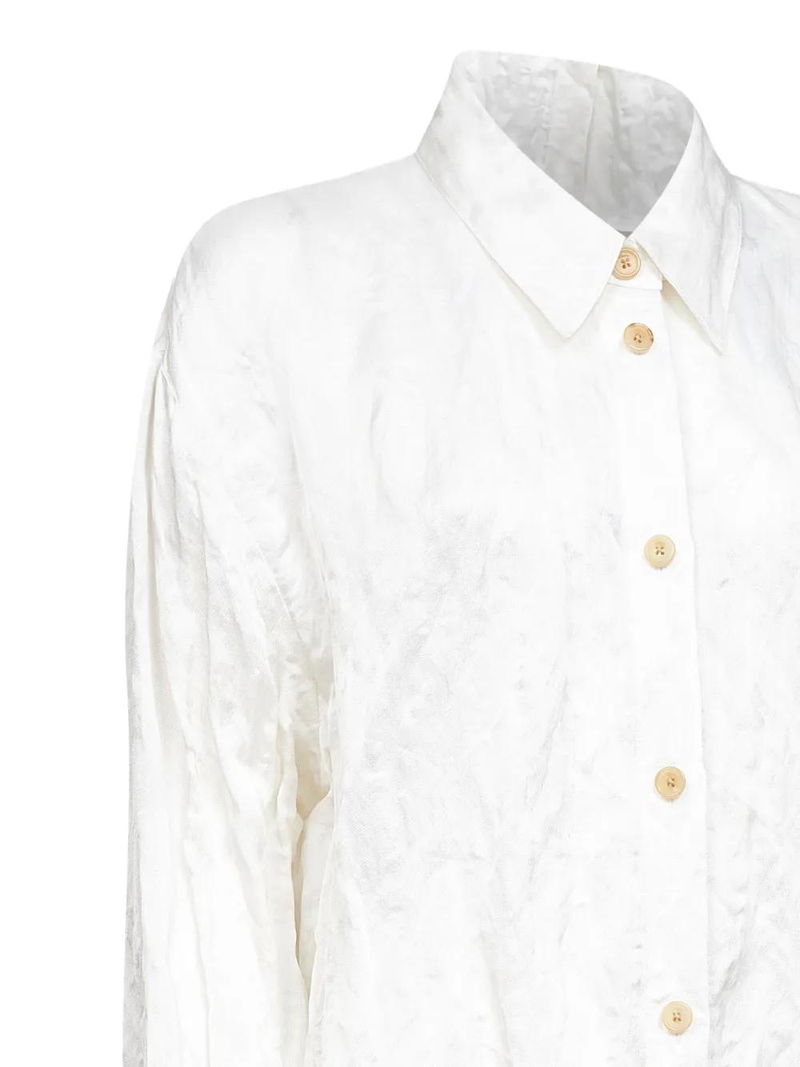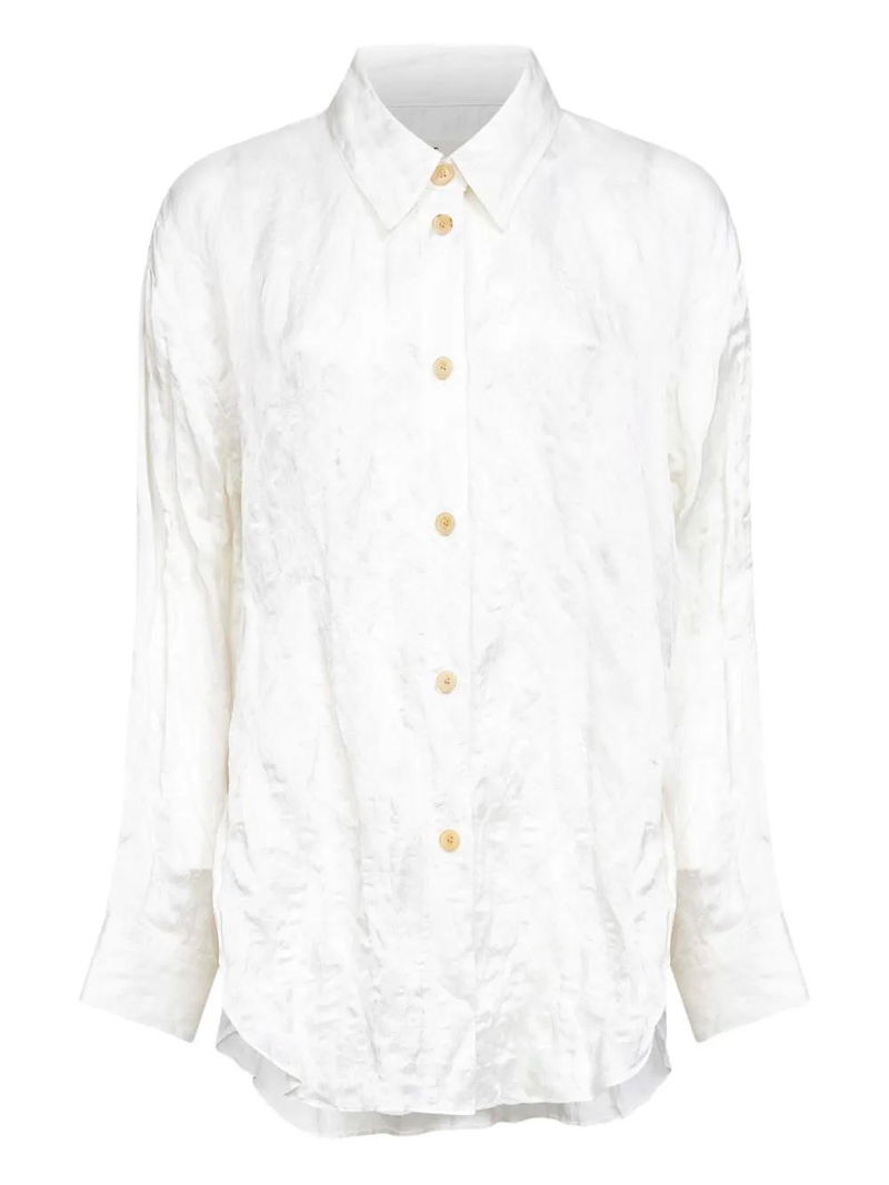 White front button placket classic collar long sleeves side slits crinkled effect.