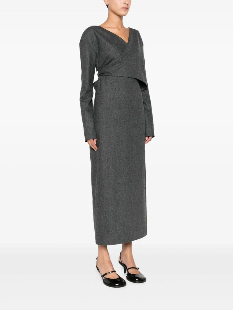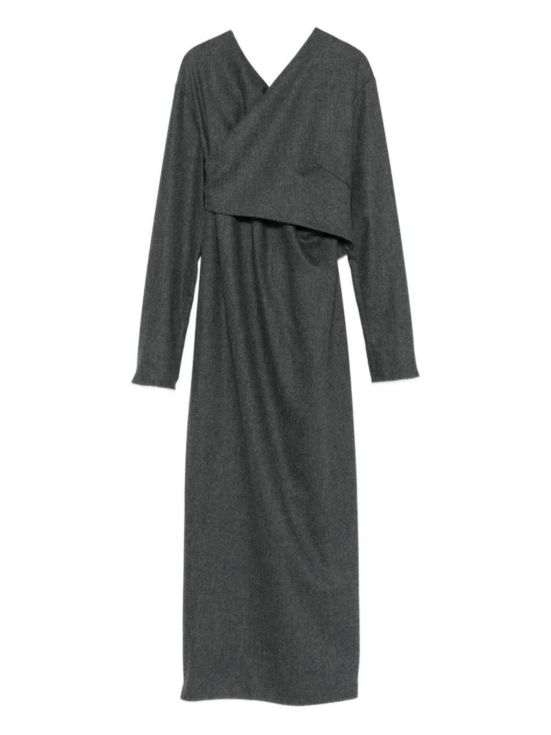 Grey cross-neck design wrap bodice long sleeves midi length.