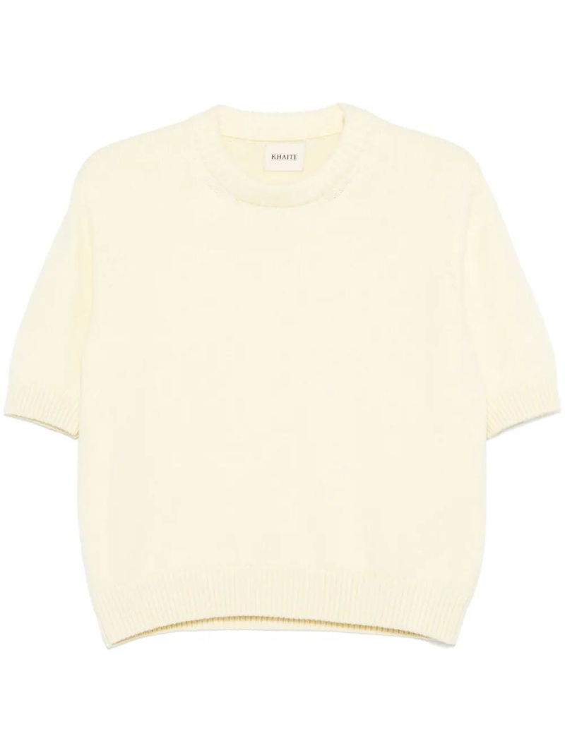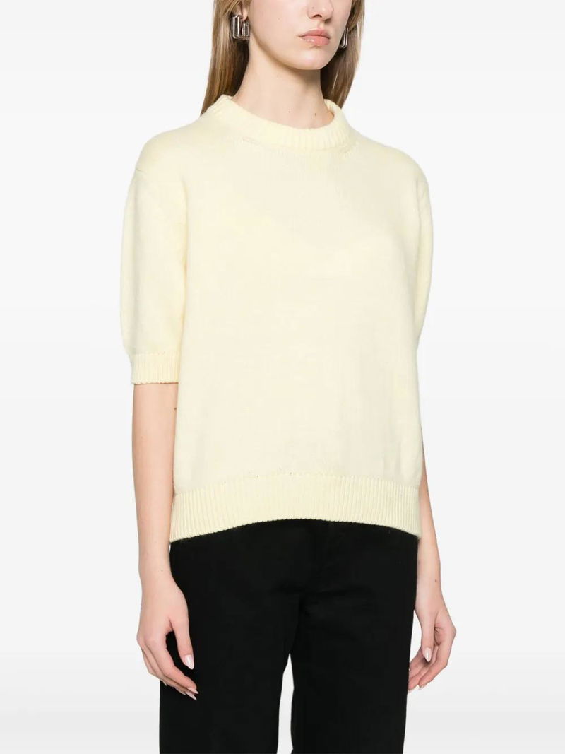 Light yellow crew neck short sleeves ribbed cuffs and hem.