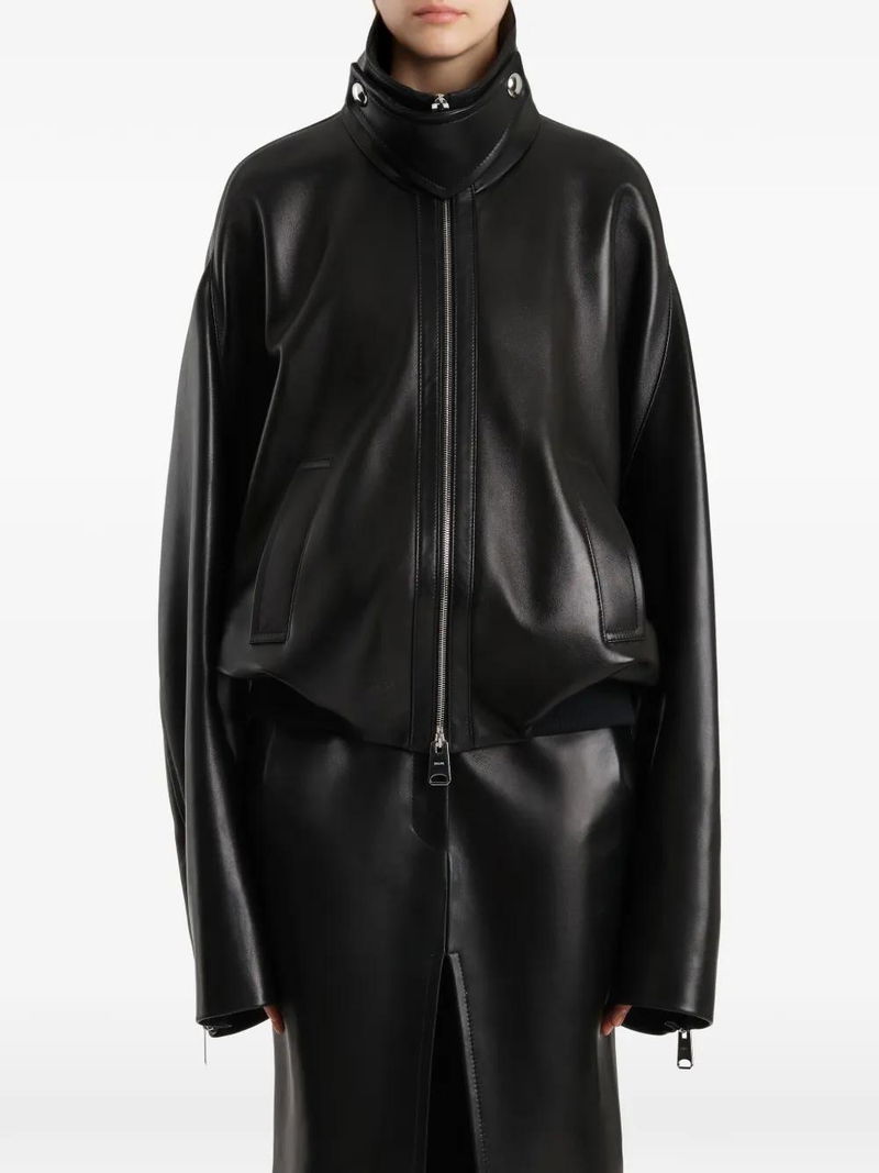 A reimagined bomber in buttery soft nappa lambskin. The relaxed, rounded silhouette is made in Italy with a stand collar fortified by a removable collar guard. Refined by welted side pockets and signature silver hardware at the two-way zipper and zippered cuffs. Tonal knit panels at elasticated hem. Lined in silky cupro twill.