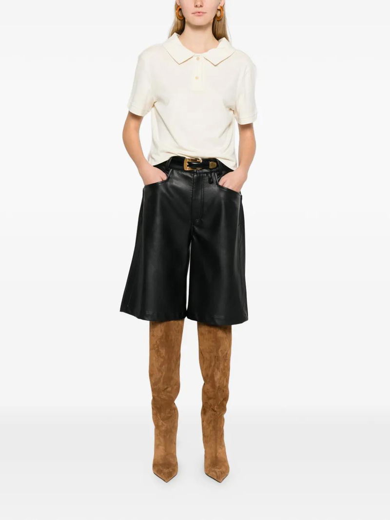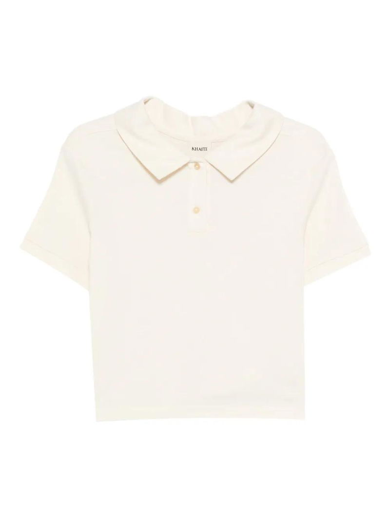 Light beige, polo collar, button closure, short sleeves.
