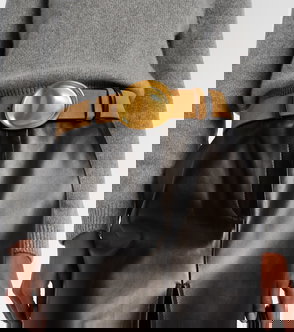 KHAITE's 'Keefe' belt was styled with several looks on the label's Spring '26 runway in New York. It's made from smooth leather in a medium-width profile and centered with an antiqued gold-tone buckle in an organic oval shape. Wear yours low on the hips with a cropped or tucked-in top.