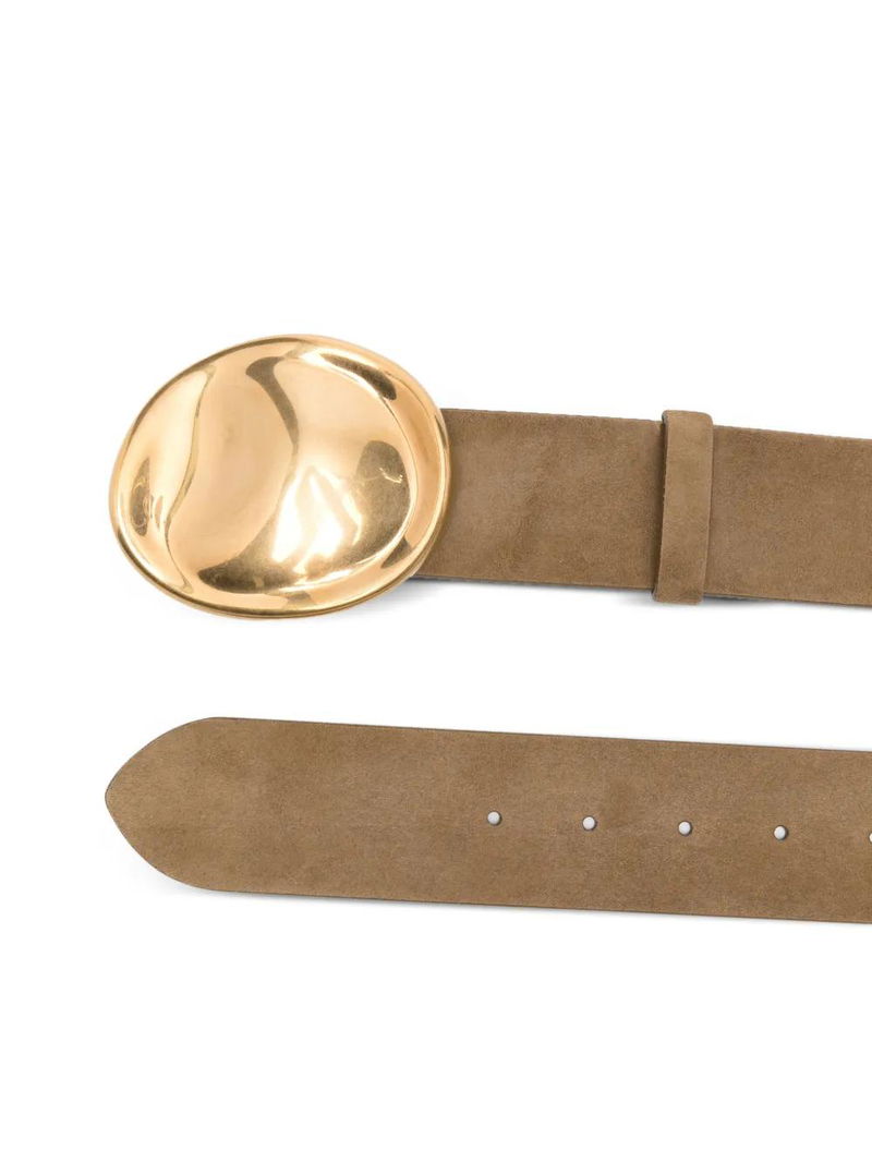 Keefe Suede Antique-Gold Belt. gold-tone hardware oval buckle This piece comes complete with a protective dust bag.