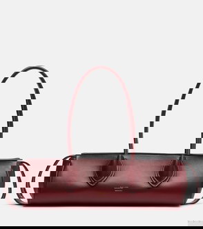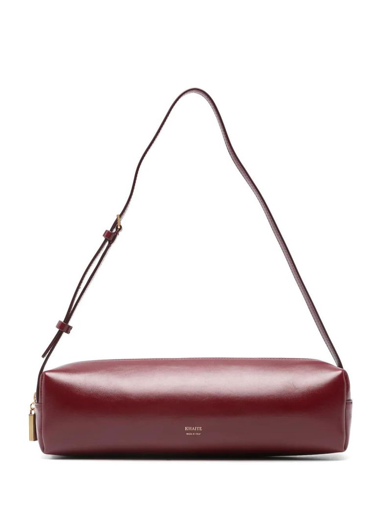 Burgundy cylindrical shape top zip fastening adjustable shoulder strap gold-tone hardware.