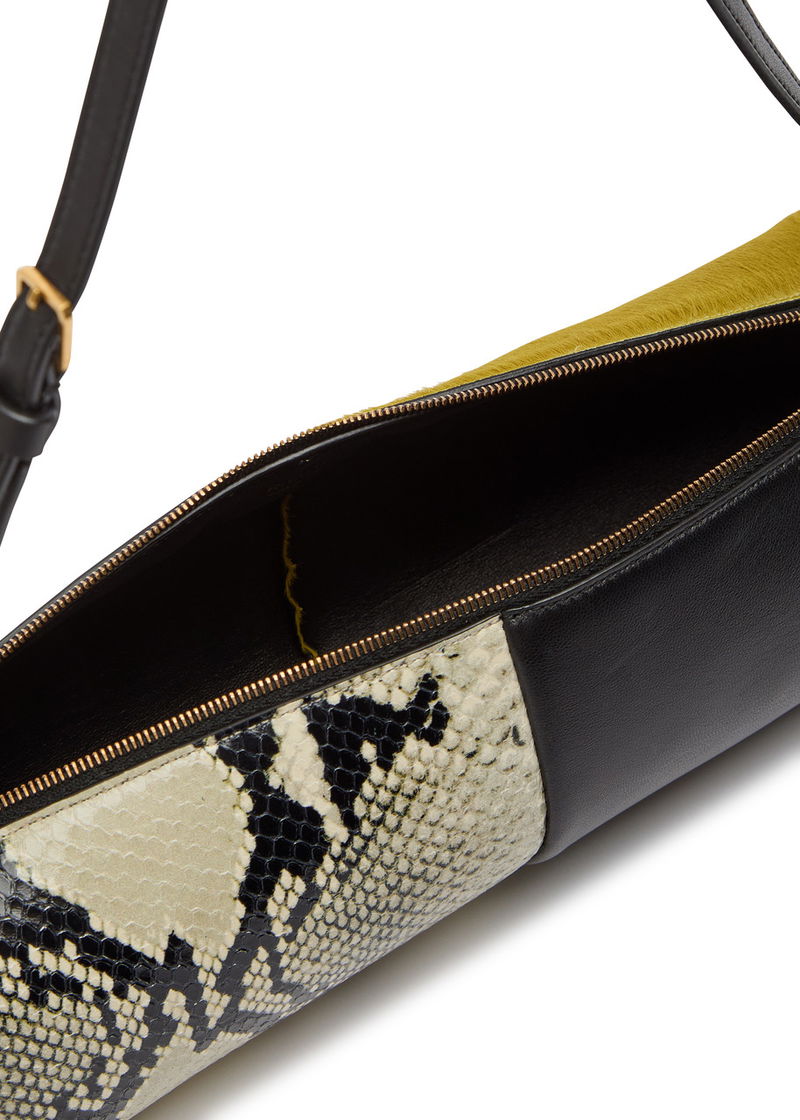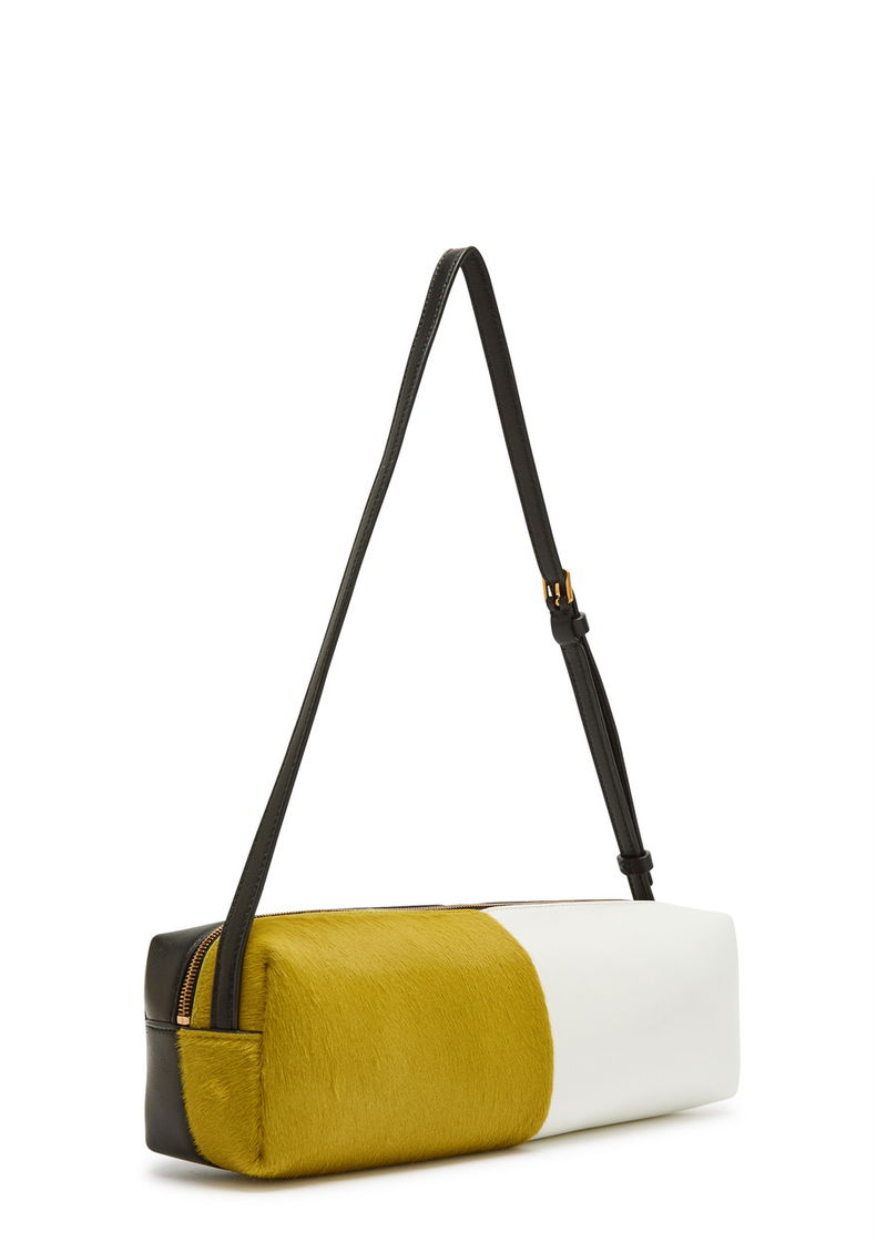 • Quartet of leather and calf-hair, adjustable shoulder strap, metallic designer stamp