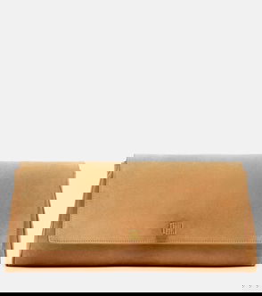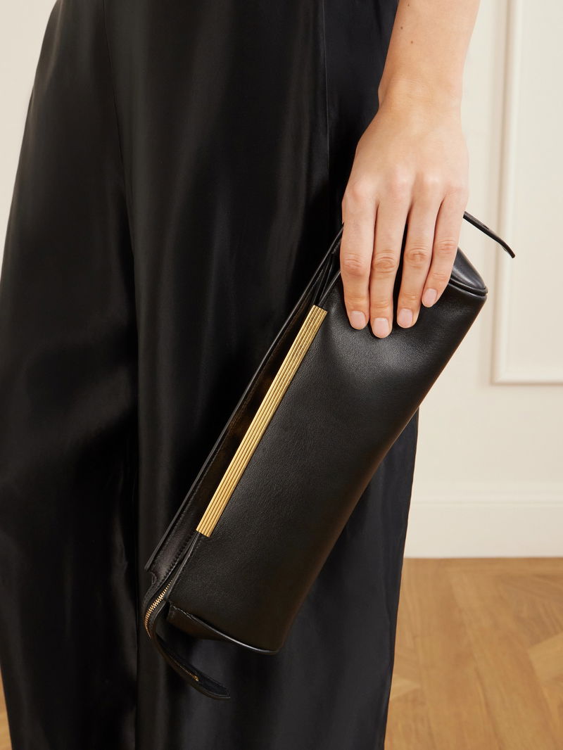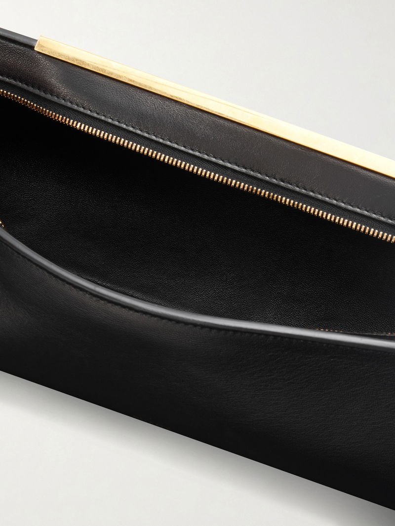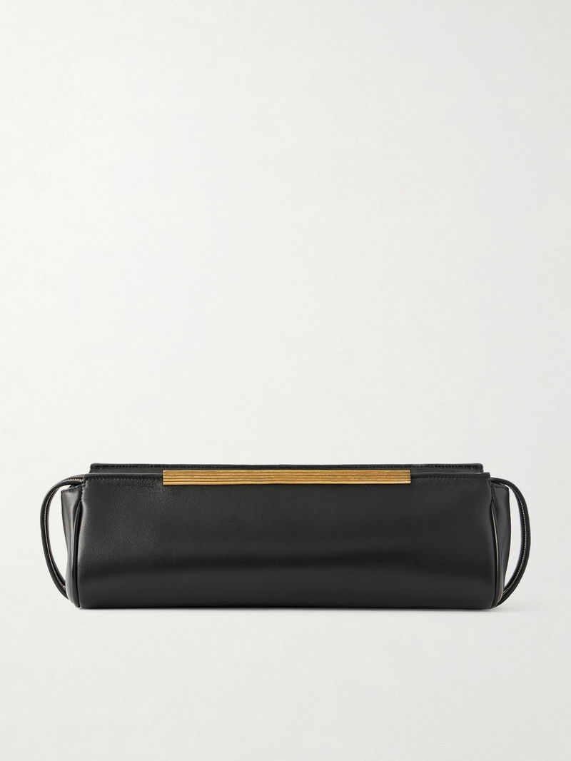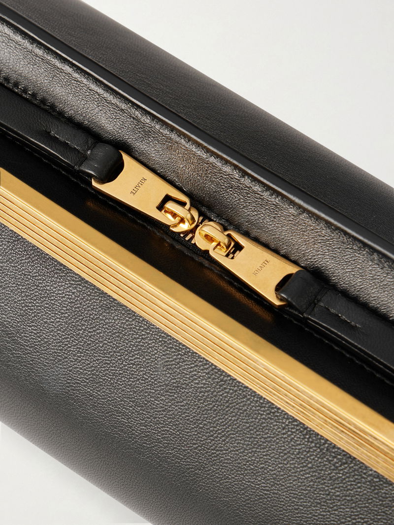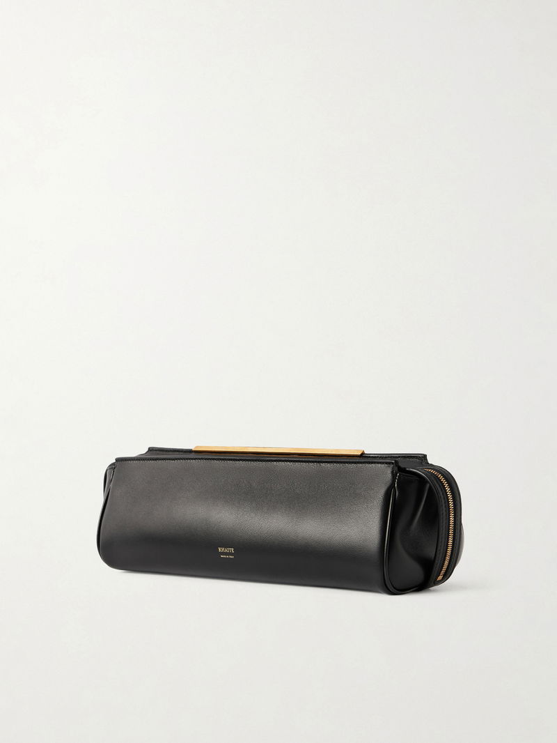 Architectural minimalism defines the accessories of Khaite. The 'Donna' evening clutch is crafted in Italy from nappa lambskin in a sleek east-west silhouette. Paneled and gently gusseted, the elongated shape is finished with signature Empire hardware and soft leather that lends a fluid feel.