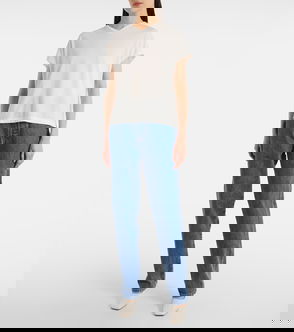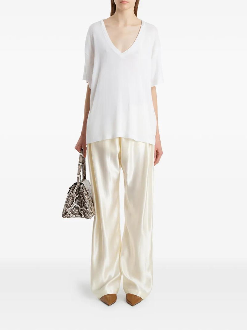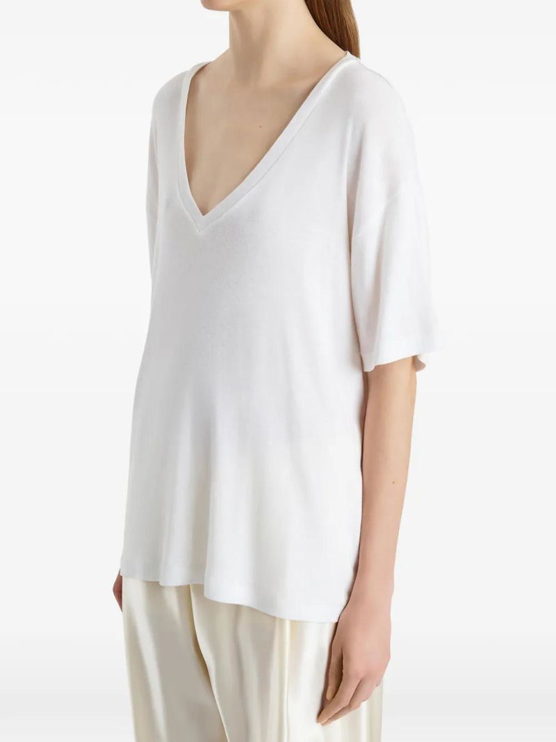 An easy-fitting v-neck t-shirt with an alluring edge. Cut from cashmere-softened cotton jersey selected for its dry, washed texture and fluid drape. The relaxed silhouette is refined by ladder stitching along the short sleeves and hem. Slips on. dry cotton cashmere.