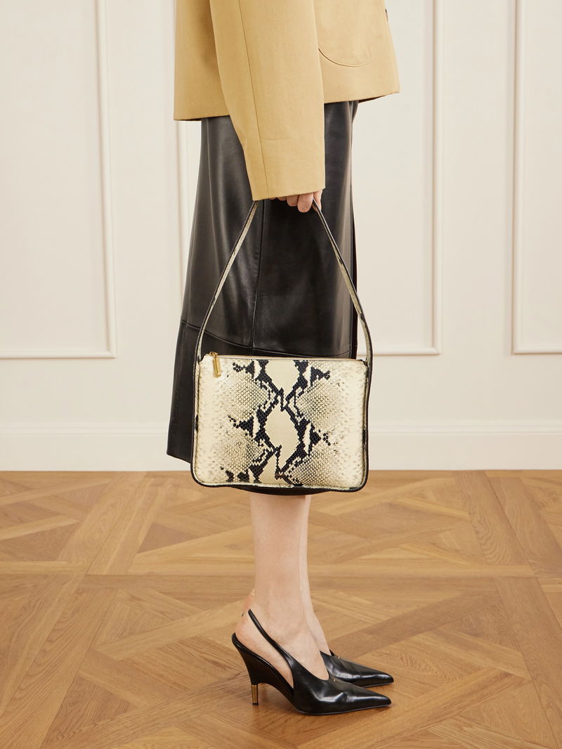KHAITE's 'Lori' bag reflects the label's sophistication and unmistakable edge. Made from snake-effect leather, it has a clean, square shape and is topped with a softly curved strap. The kind of piece that slips into your everyday rotation, it offers plenty of space for essentials such as your phone, cardholder and keys.