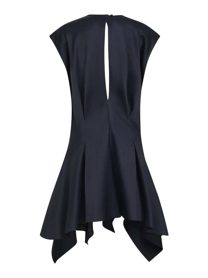 Black V-neckline cap sleeves asymmetric hemline.