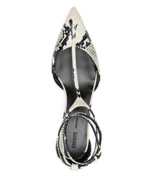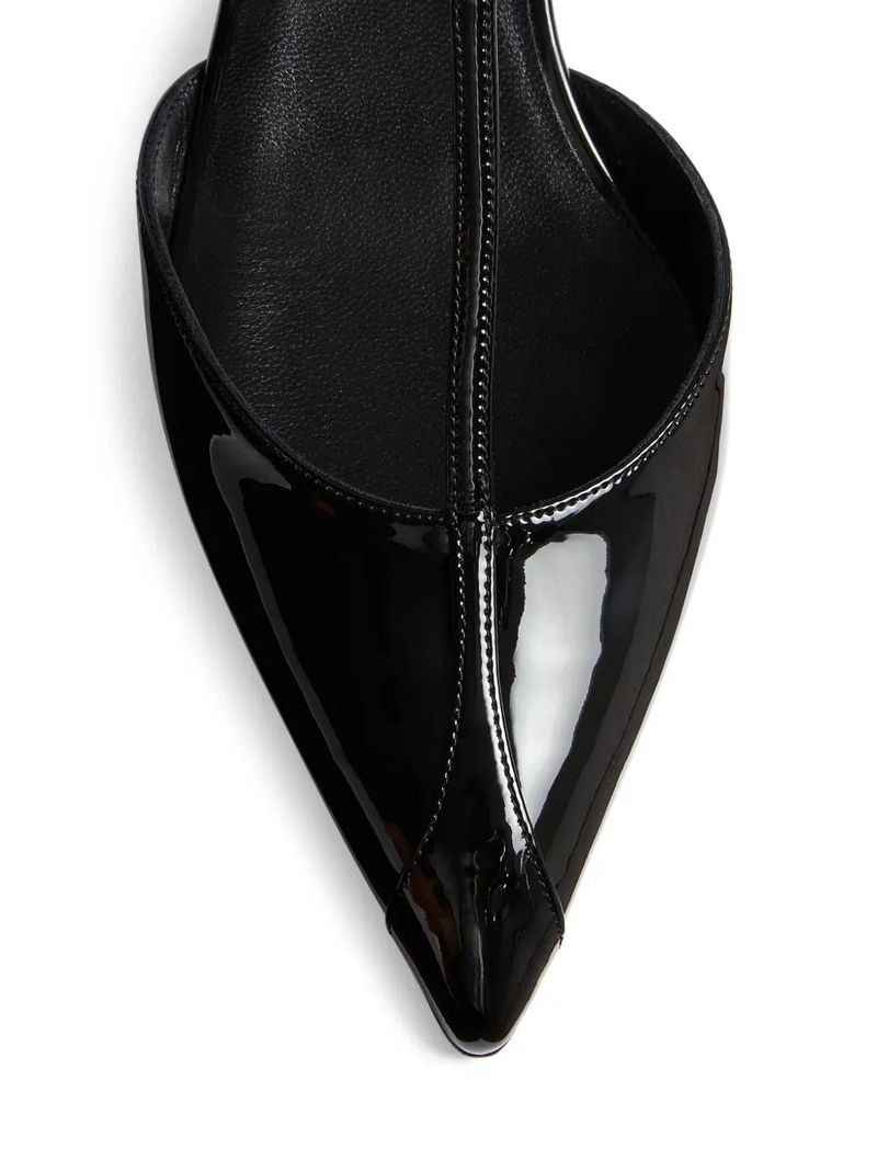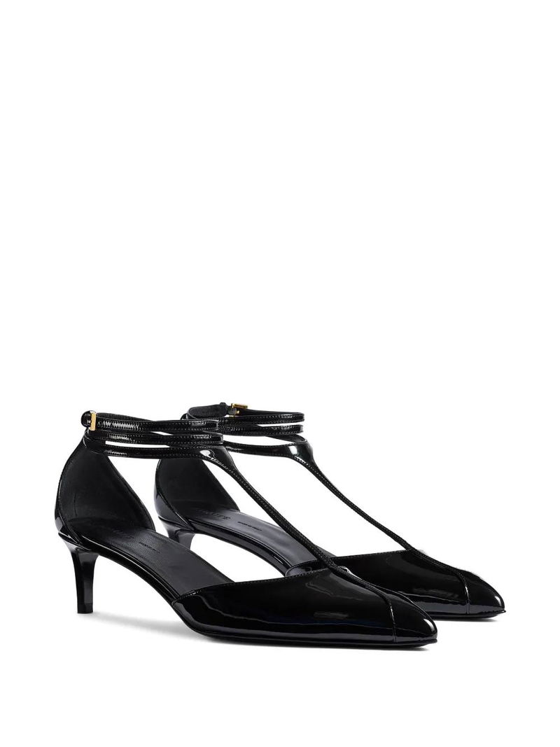 Black, T-strap, pointed toe, ankle strap, gold-tone buckle, stiletto heel.