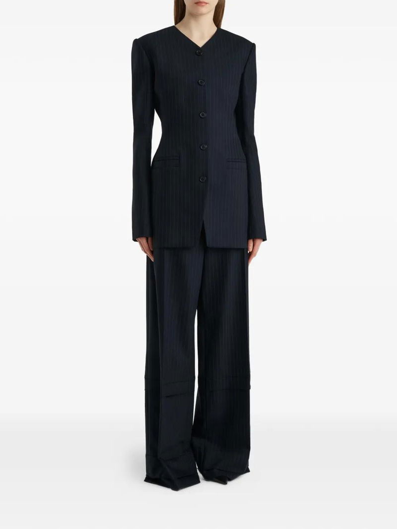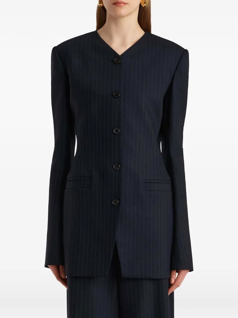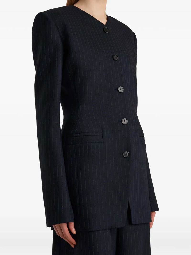 Navy blue, pinstripe pattern, button fastening, front pockets, long sleeves, buttoned cuffs.