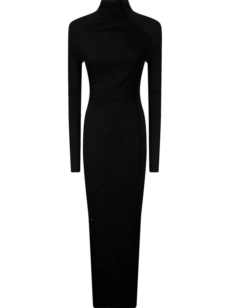 Black concealed rear zip fastening high neck long sleeves raw-cut edge.