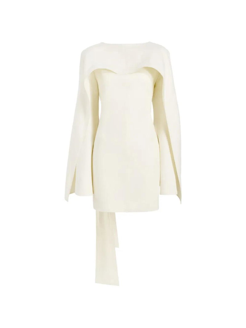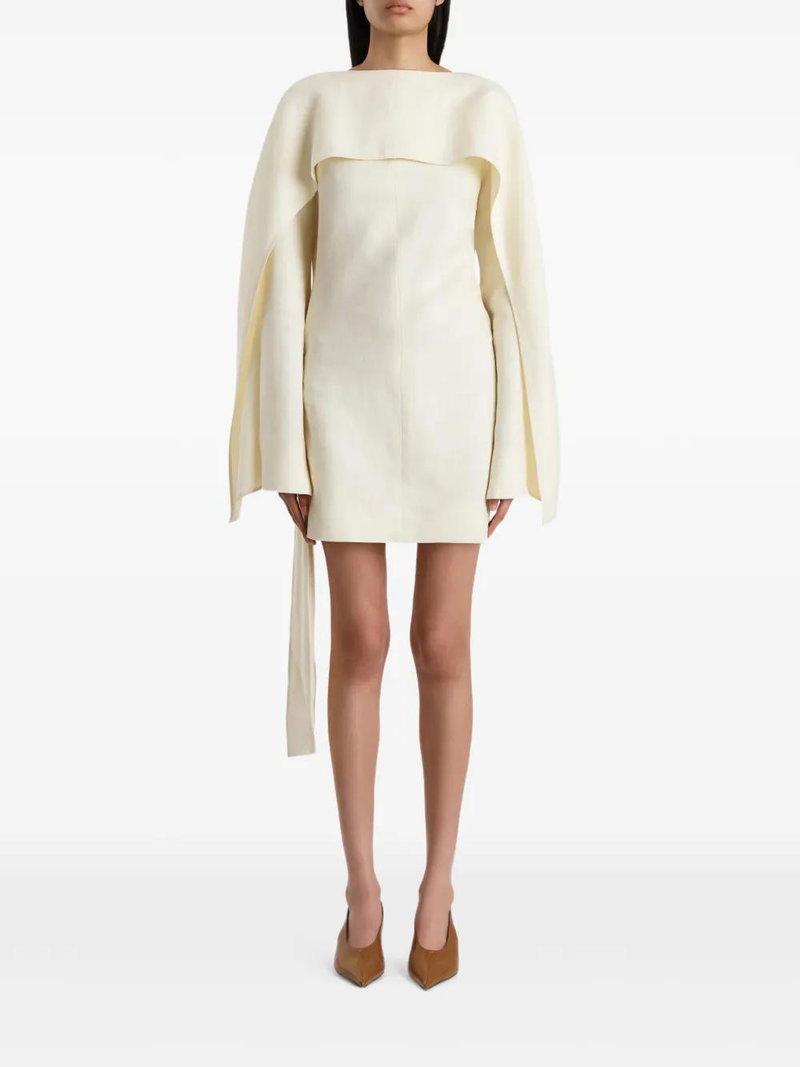 A dynamically draped minidress in Italian linen suiting that is densely woven for a beautiful drape with reduced wrinkling. Framed by elongated and angled sleeves, the tapered silhouette is animated by a draped panel and a self tie at the side for a customized fit.