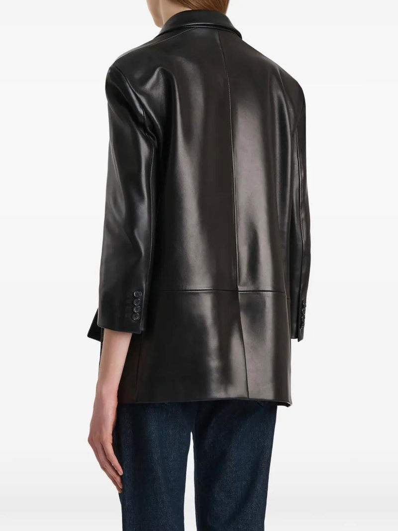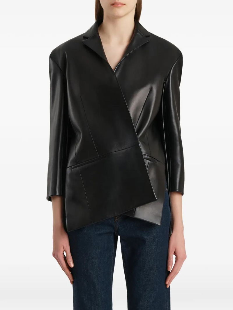 A striking jacket defined by artful, angular layers. Tailored in buttery soft lambskin, the twisted wrap-front silhouette is framed by a compact notched collar, with extended and forward-sitting shoulders, cropped sleeves, and a central seam at back.