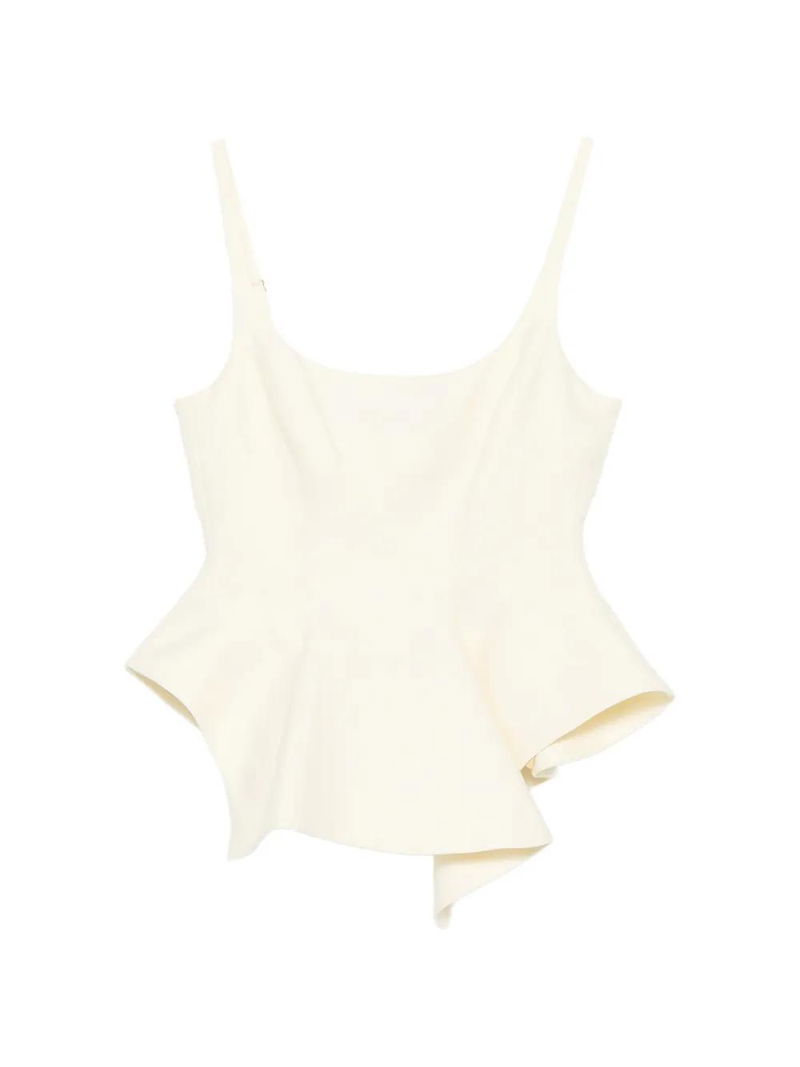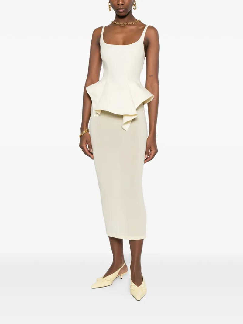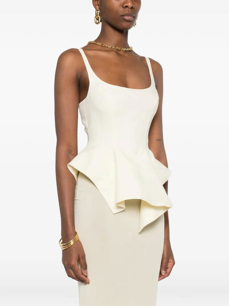 Light yellow square neck peplum hem adjustable shoulder straps.
