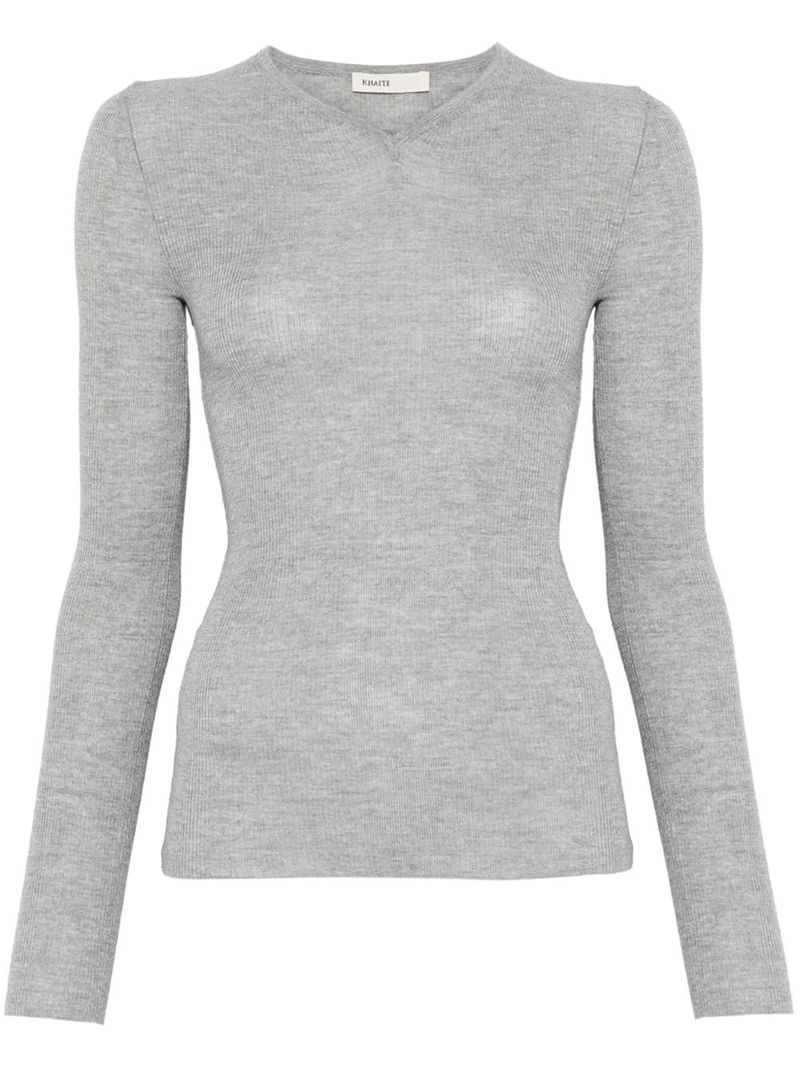 Light grey, V-neck, long sleeves.