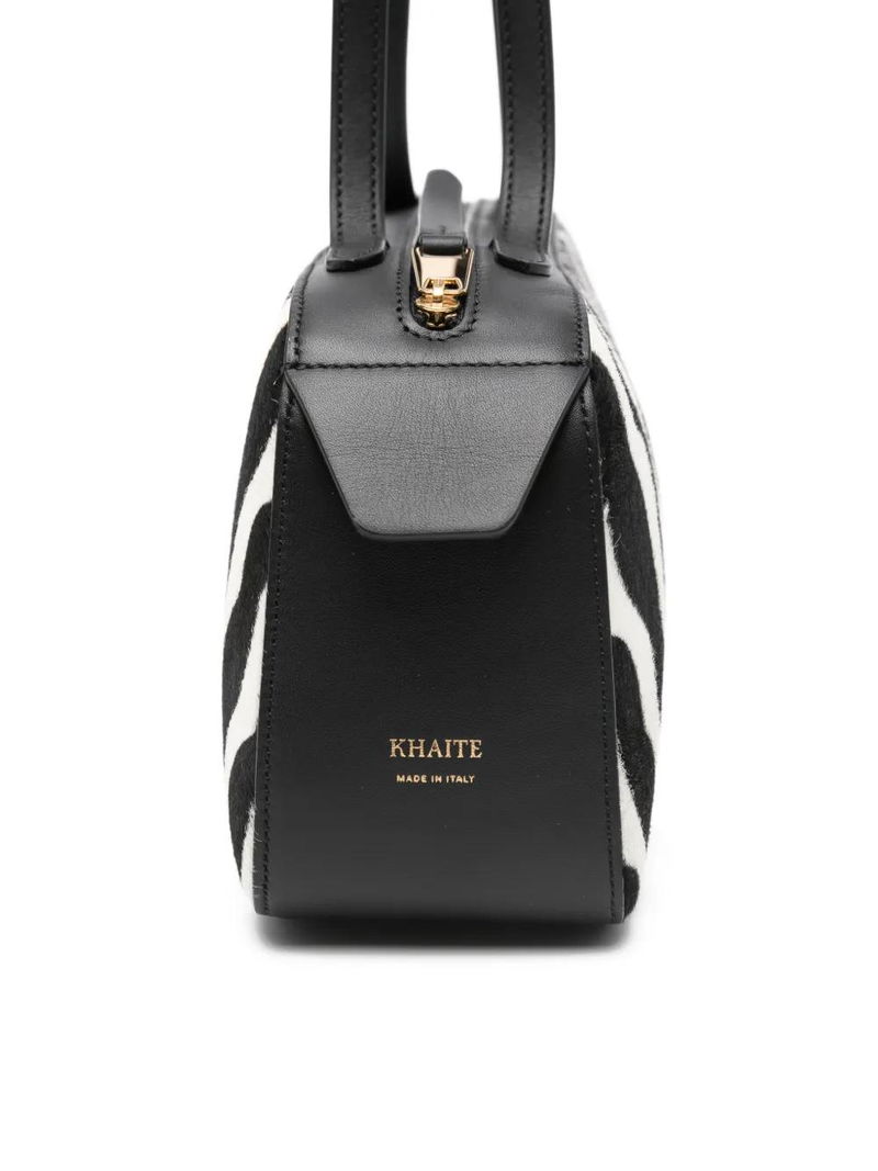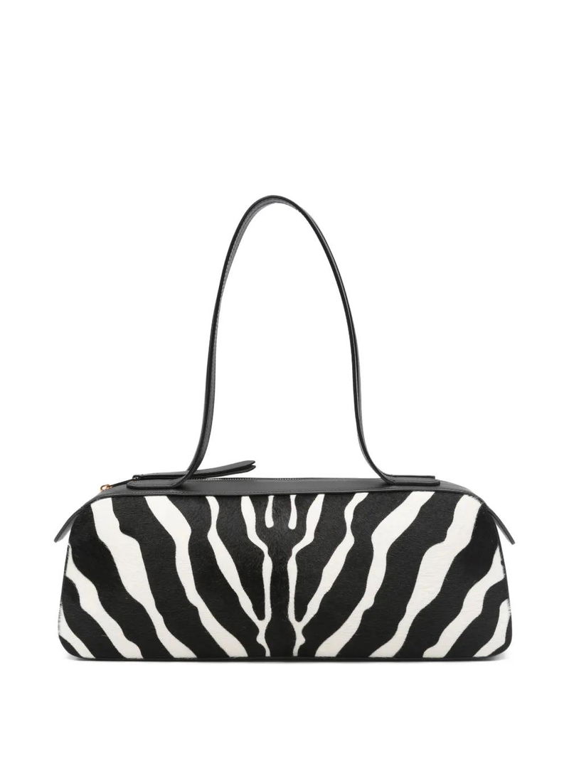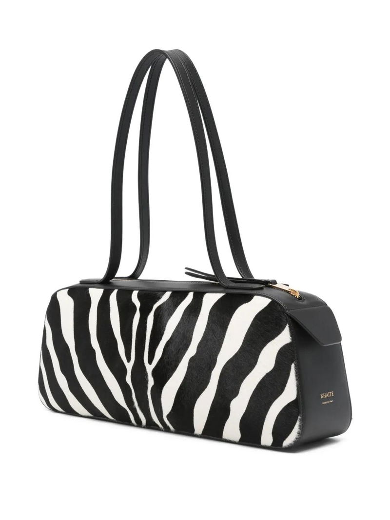 Black zebra print, top handle, zip fastening, gold-tone hardware.