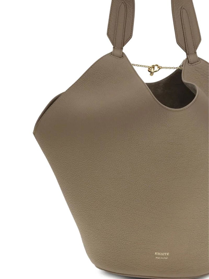 Olive green, grained texture, shoulder strap, front logo stamp, toggle closure, single compartment.