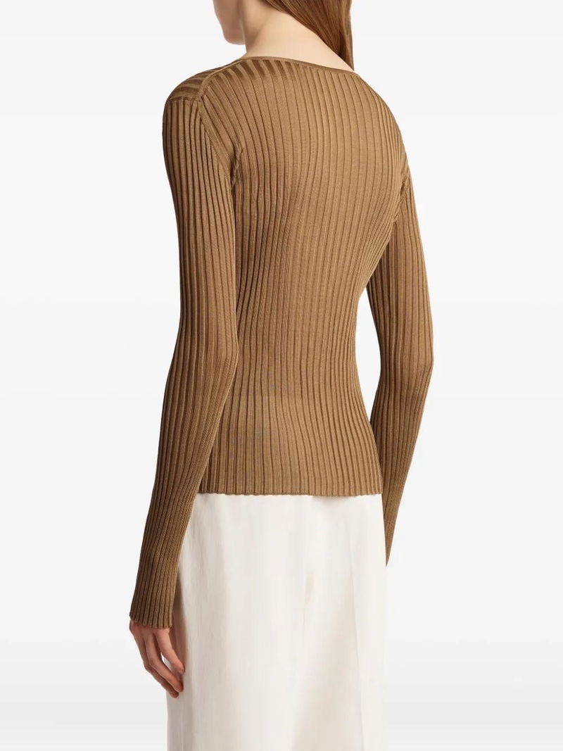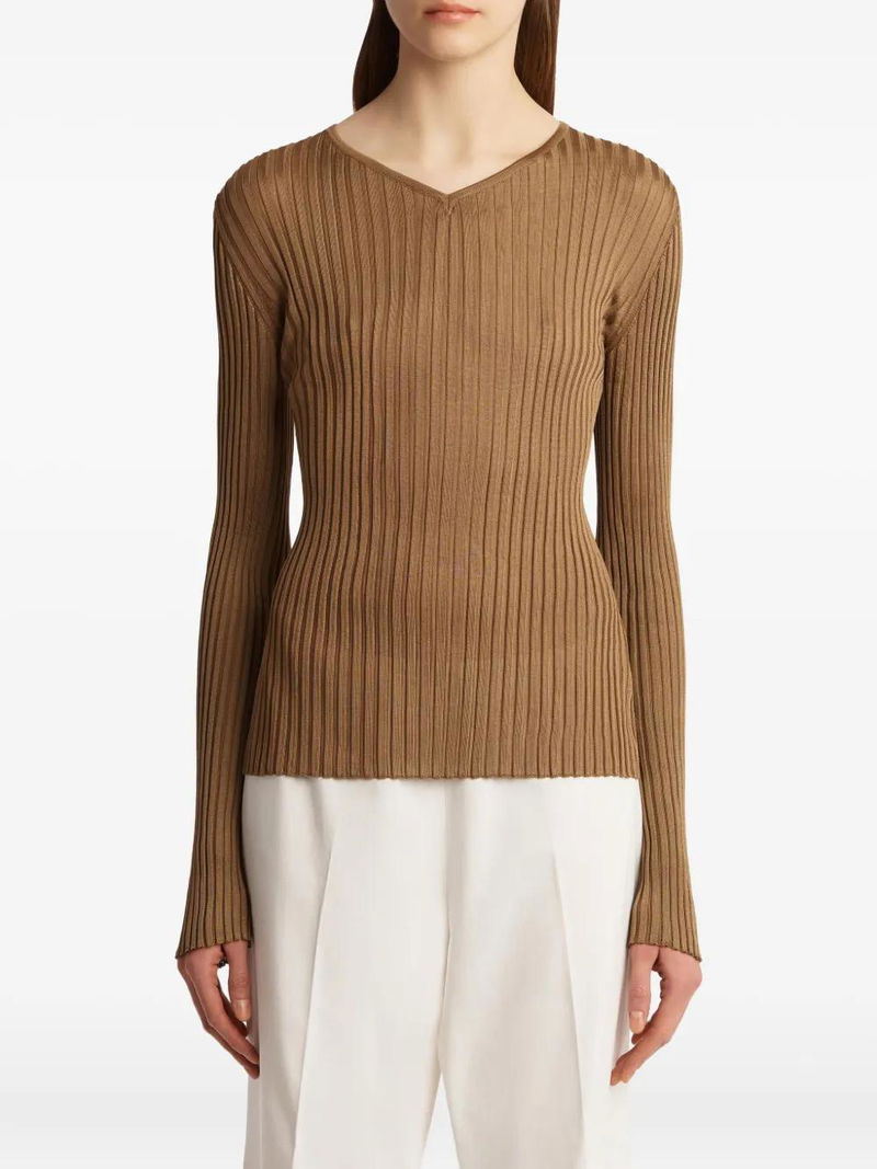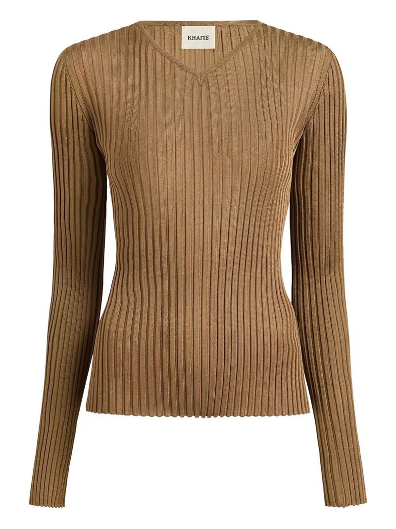 Tia Ribbed V-neck Top - Brown