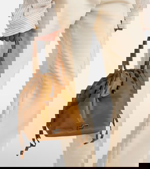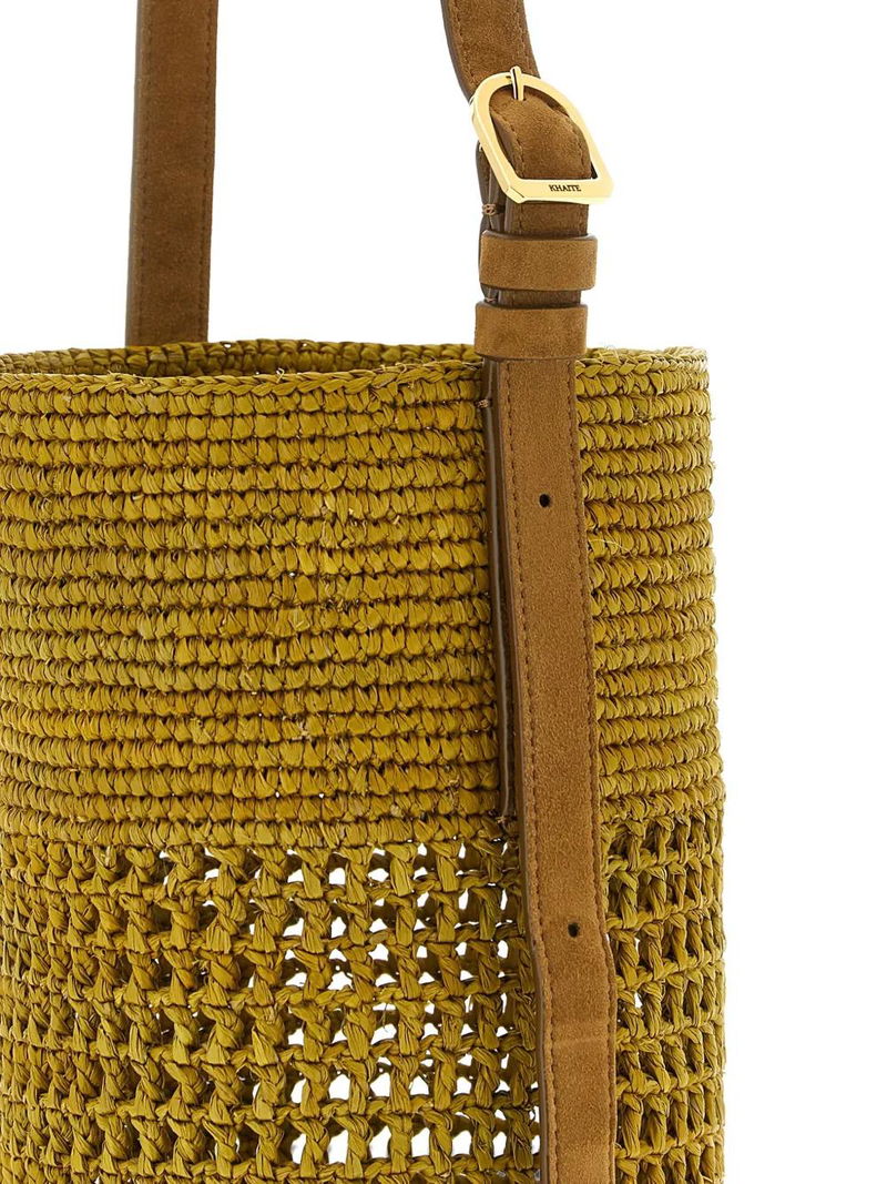 Brown, woven raffia, adjustable shoulder strap, cylindrical silhouette.