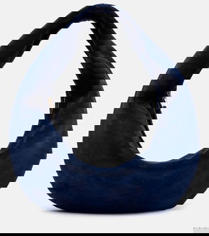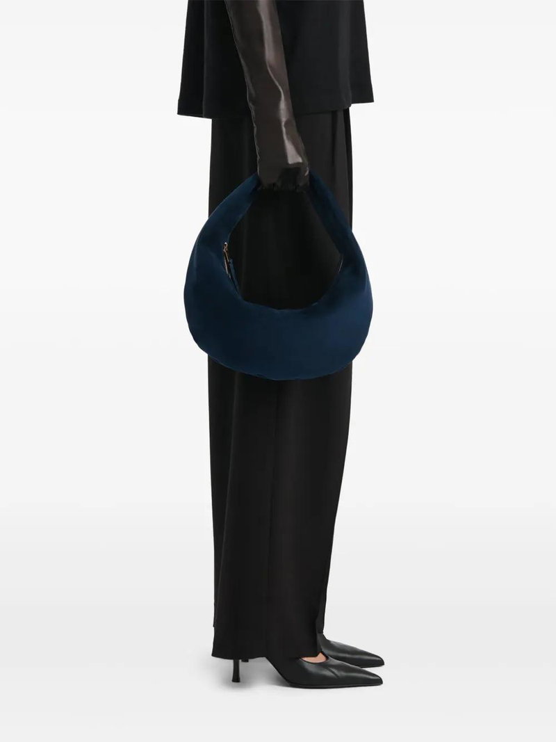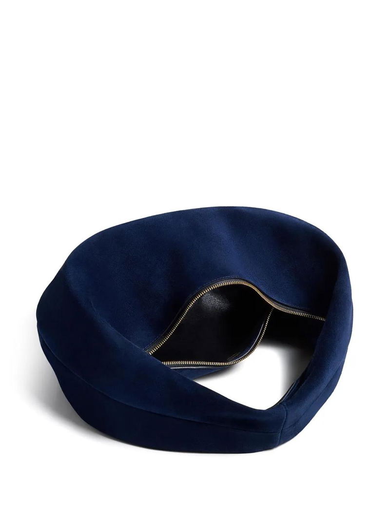Dark blue, calf suede, zip fastening, top handle.