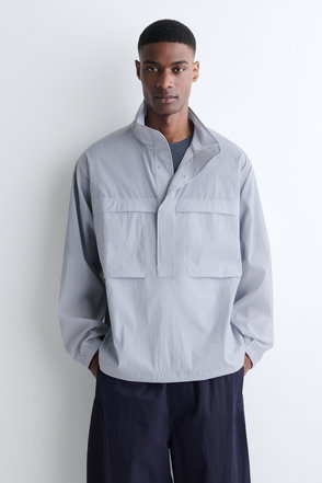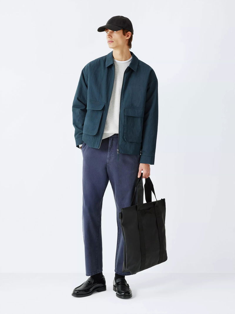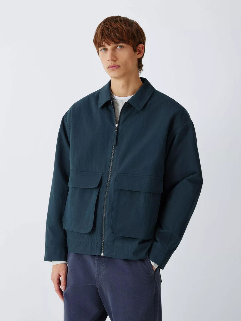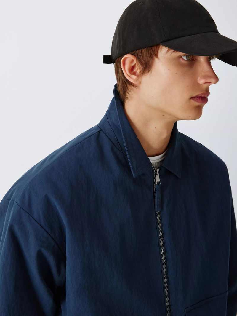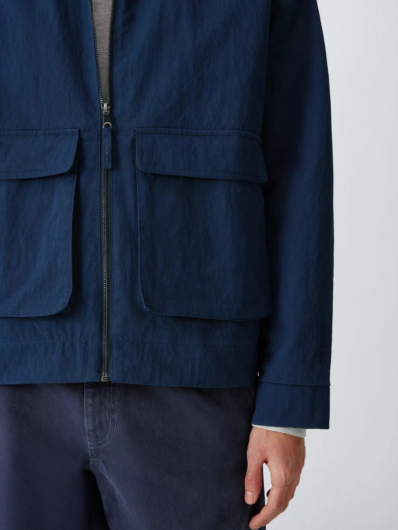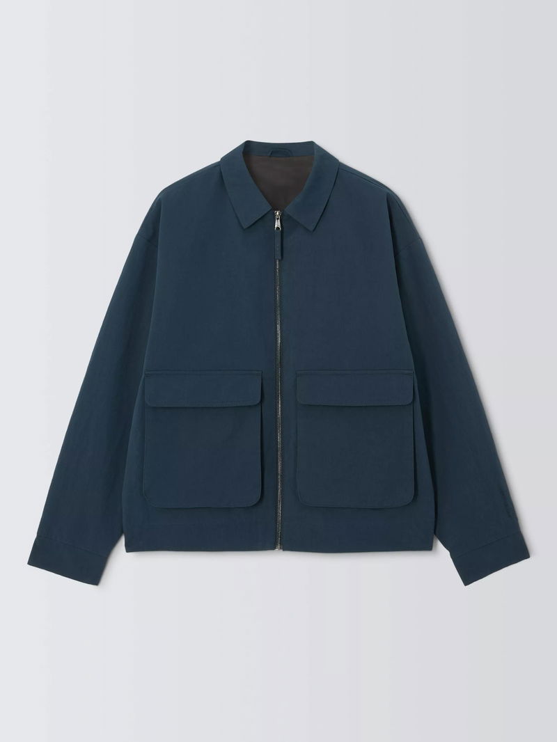 Structure meets substance in this reimagined Harrington jacket, defined by oversized patch pockets for a utility-inspired look. The clean-lined silhouette is anchored by a sharp pointed collar and a silver-tone zip. The modern, boxy fit layers effortlessly over seasonal knitwear or tailored separates. Crafted from a resilient nylon and cotton blend, the shell stands up to the elements while remaining soft to the touch with its moleskin finish. Lightweight wadding offers essential warmth without unnecessary bulk, creating a hardwearing transitional staple that balances heritage workwear influences with a sophisticated, contemporary edge.