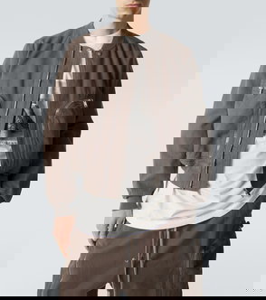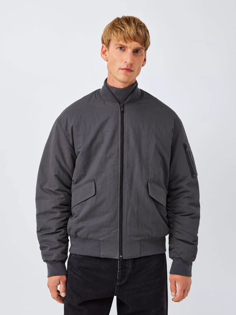 A zip-fastened bomber jacket with ribbed detailing, two patch pockets and one other placed conveniently on the sleeve.