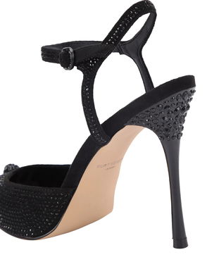 The Chelsea Point Slip-On is a black croc embossed loafer from Kurt Geiger London with a pointed toe and supple heel to be worn as a mule or full loafer. With crystal-embellished antiqued brass oval trim and eagle head decoration.