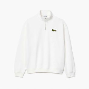 Unisex Lacoste Loose Fit Zip Neck Badge Accent Sweatshirt in black Lacoste expert sportswear creators since 1933 are proud to present this essential design featuring a high zipped neck. Featuring a loose fluid cut minimalist design and comfortable fleece fabric for the ultimate in relaxed chic finished with an XL crocodile. This unisex product runs large if you are a woman choose 1 size smaller than your usual size.