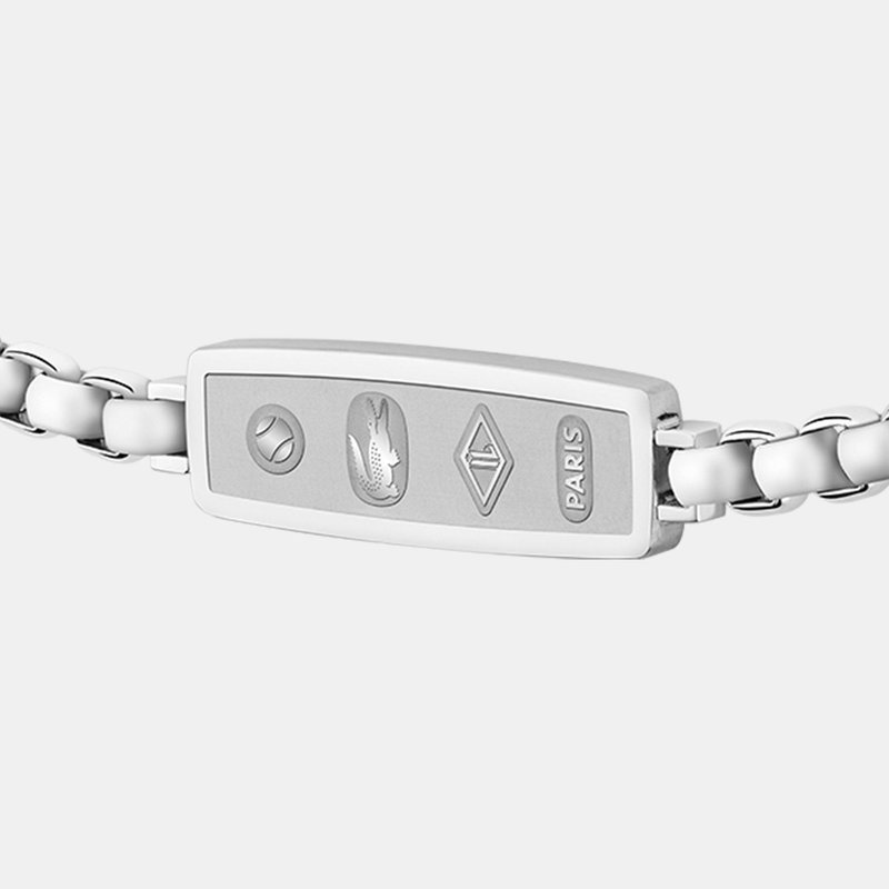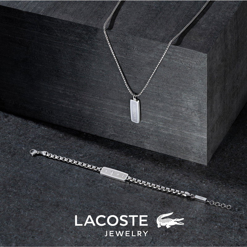 Refined, versatile, and beautifully finished, the District collection from Lacoste comprises a box-chain necklace and matching bracelet both in stainless steel, or gold IP. The focal point of each elegant piece is its tag-style pendant or plaque, which features the Lacoste logo on one side, and four timeless icons on the other: tennis ball, crocodile, Lacoste L, and Paris motifs. A stylish companion for the modern man, this contemporary collection captures the enduring essence of the French brand. stainless steel reversible box chain bracelet. Etched icons plaque and branding.