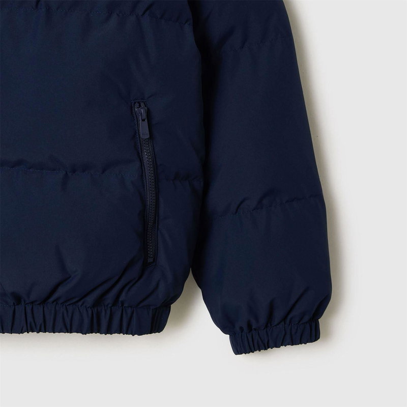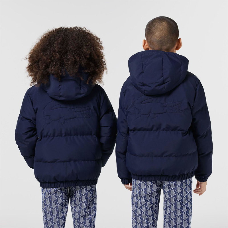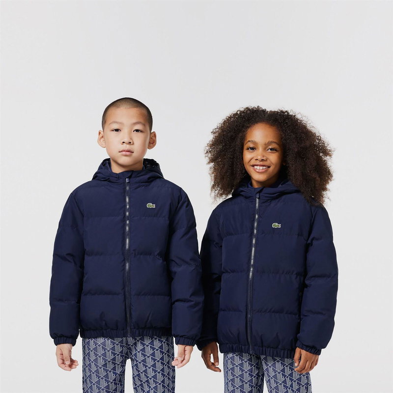 Juniors Lacoste Padded Jacket in navy. Hooded design. Full front zip fastening. Two zippered side pockets. Elasticated cuffs and hem. Signature embroidered Lacoste crocodile logo on the left chest. Warm lightweight filling. Water-repellent recycled polyester fabric.