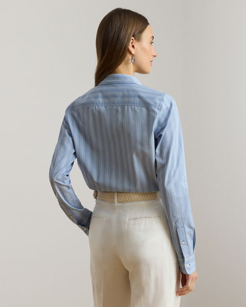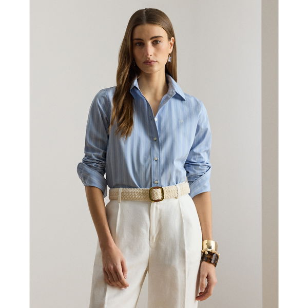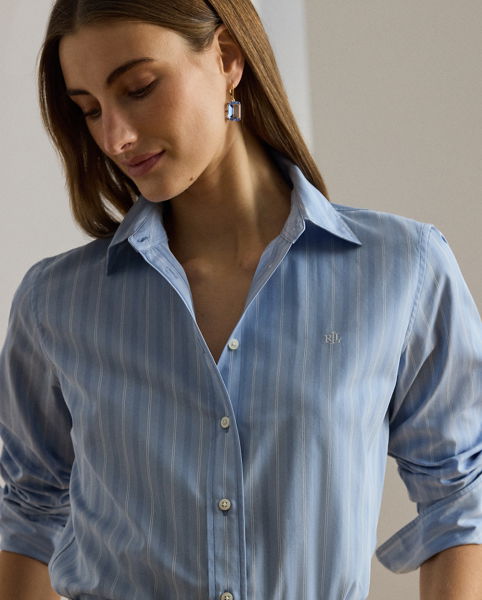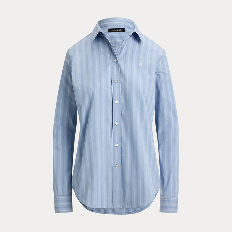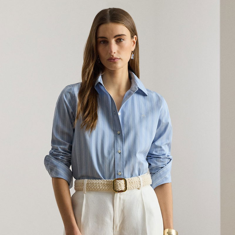 Tailored with crisp cotton broadcloth, this essential collared shirt features subtle variegated stripes, signature buttons, and an “LRL”-embroidered logo at the chest.